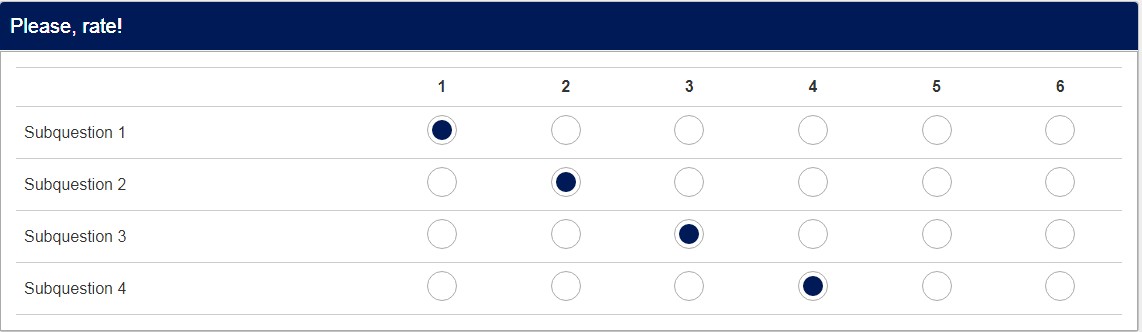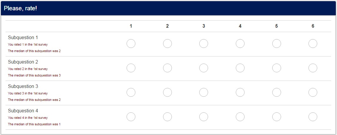 Subquestion 1 <span style="color:maroon;font-size:8pt">{if(!is_empty(TOKEN:ATTRIBUTE_1),"<br>You rated "+TOKEN:ATTRIBUTE_1+ " in the 1st survey<br>The median of this subquestion was "+TOKEN:ATTRIBUTE_5,"")}</span>