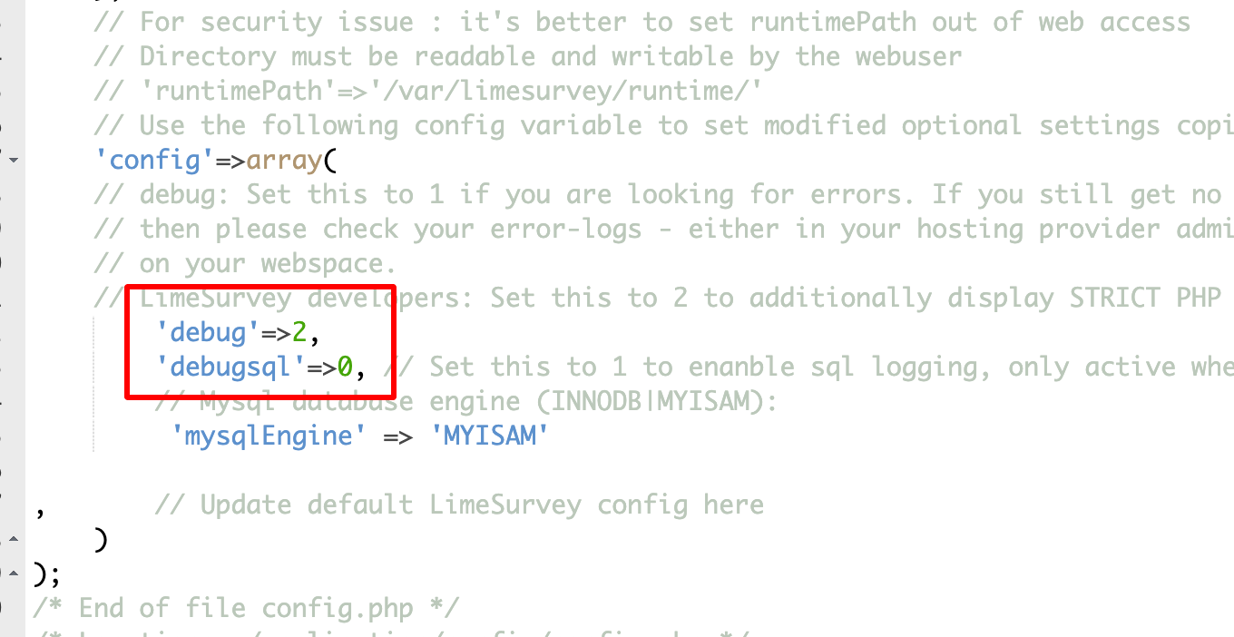 'config'=>array( 'debug'=>2, 'debugsql'=>0, )