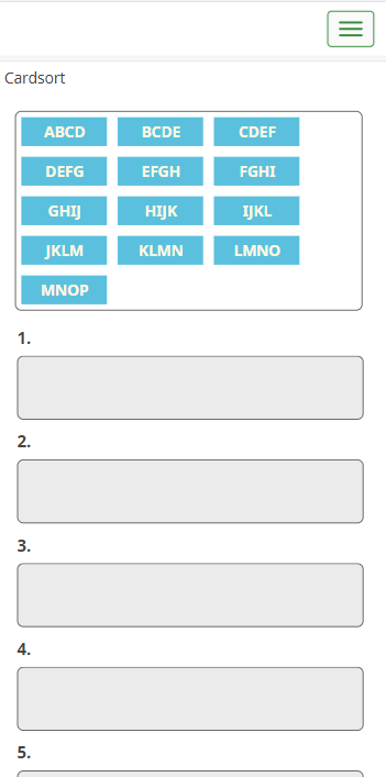 <style type="text/css"> .card-sort-question .items-start { width: 94%; max-width: 100%; height: auto; min-height:80px; margin-top: 8px; margin-left: 3%; border: 1px solid #666; -moz-border-radius: 6px; -webkit-border-radius: 6px; -khtml-border-radius: 6px; border-radius: 6px; } .card-sort-question .card { width: auto; min-width:80px; height: auto; margin: 5px 5px; padding: 4px; background-color: transparent; background-color: #5bc0de; color: #fcf8e3; border:0; -moz-border-radius: 0px; -webkit-border-radius: 0px; -khtml-border-radius: 0px; border-radius: 0px; } .card-sort-question .items-end-wrapper { float: left; margin-left: 3%; width: 94%; max-width: 100%; margin-top: 15px; } @media (min-width: 560px){ .card-sort-question .items-end-wrapper { display: flex; } } .card-sort-question .items-end-inner { display: inline-block; width:100%; margin-right: 0.5%; margin-left: 0.5%; } .card-sort-question .items-end { min-height: 60px !important; } .card-sort-question .items-end-text { text-align:left; } .card-sort-question .items-end .card { margin: 5px 7px; color: #fcf8e3; background-color:#5bc0de; } </style>