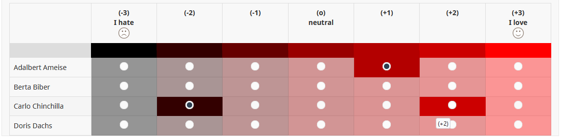 <style type="text/css"> /* set width of "gradient" header */ .custom-array table.subquestion-list thead td, .custom-array table.subquestion-list thead th { border-bottom-width: 30px; border-bottom-style: solid; } /* set colors of "gradient" header */ .custom-array table.subquestion-list thead .column-1 { border-bottom-color: #000000; } .custom-array table.subquestion-list thead .column-2 { border-bottom-color: #330000; } .custom-array table.subquestion-list thead .column-3 { border-bottom-color: #660000; } .custom-array table.subquestion-list thead .column-4 { border-bottom-color: #990000; } .custom-array table.subquestion-list thead .column-5 { border-bottom-color: #b30000; } .custom-array table.subquestion-list thead .column-6 { border-bottom-color: #cc0000; } .custom-array table.subquestion-list thead .column-7 { border-bottom-color: #ff0000; } /* set colors of hovered resp. active(selected) cells */ /* Of course you can split this to have different colors for hovered and active cells */ .custom-array td.column-1:hover, .custom-array td.active-item.column-1 { background-color: #000000; opacity:1.0; } .custom-array td.column-2:hover, .custom-array td.active-item.column-2 { background-color: #330000; opacity:1.0; } .custom-array td.column-3:hover, .custom-array td.active-item.column-3 { background-color: #660000; opacity:1.0; } .custom-array td.column-4:hover, .custom-array td.active-item.column-4 { background-color: #990000; opacity:1.0; } .custom-array td.column-5:hover, .custom-array td.active-item.column-5 { background-color: #b30000; opacity:1.0; } .custom-array td.column-6:hover, .custom-array td.active-item.column-6 { background-color: #cc0000; opacity:1.0; } .custom-array td.column-7:hover, .custom-array td.active-item.column-7 { background-color: #ff0000; opacity:1.0; } /* set colors of normal columns */ /* The same colors as above but with an opacity of 0.4 */ td.answer_cell_1 { background-color: #000000; opacity:0.4; } td.answer_cell_2 { background-color: #330000; opacity:0.4; } td.answer_cell_3 { background-color: #660000; opacity:0.4; } td.answer_cell_4 { background-color: #990000; opacity:0.4; } td.answer_cell_5 { background-color: #b30000; opacity:0.4; } td.answer_cell_6 { background-color: #cc0000; opacity:0.4; } td.answer_cell_7 { background-color: #ff0000; opacity:0.4; } /* Some other settings */ /* Vertical Alignment of header text */ .ls-answers .ls-heading > th { vertical-align: top; } /* Left Alignment of subquestion text */ .ls-answers tbody .answertext { text-align: left; } </style>