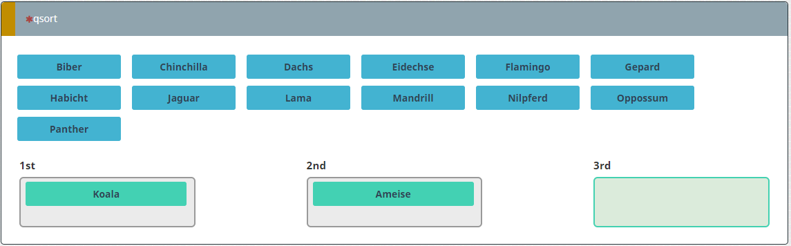 This workaround is heavily based on the Card Sorting above. It uses JavaScript to allow dragging items into "buckets" to "card sort" them with the additional twist to limit the cards per bucket. A multiple-short-text question is used with subquestions being the draggable items. The data recorded for each item is the "bucket" number that it was dropped in. "Buckets" and their limits are pre-defined in a list in the "Display" section of the question.