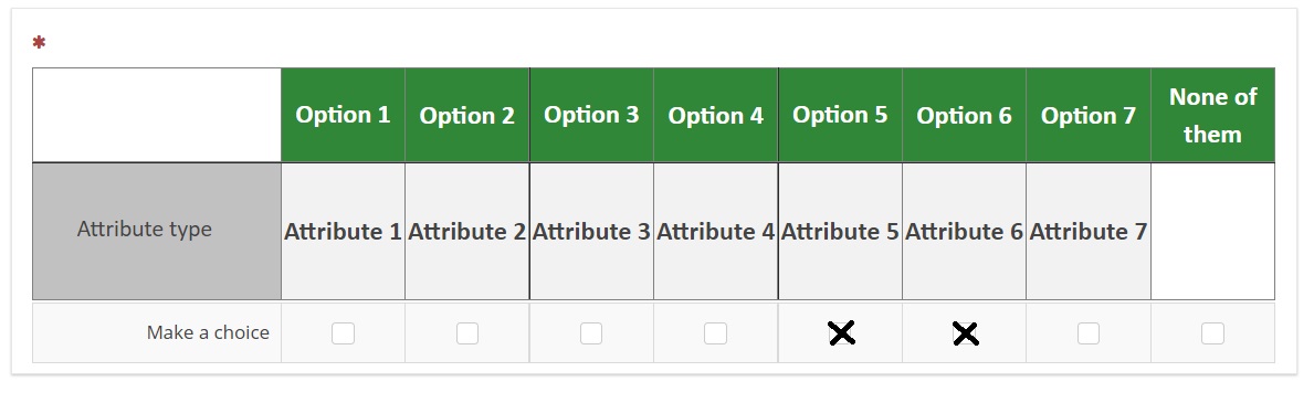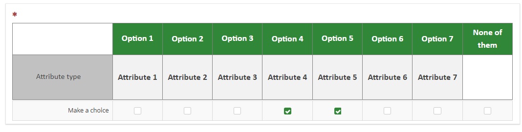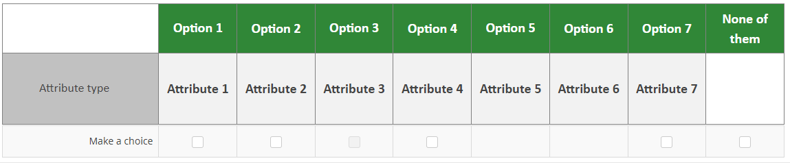 <script type="text/javascript" charset="utf-8"> $(document).ready(function() { // Remove in row 1 $('#question{QID} tr[id^="javatbd"]:eq(0) .checkbox-item:eq(4) *').remove(); $('#question{QID} tr[id^="javatbd"]:eq(0) .checkbox-item:eq(5) *').remove(); // Disable in row 1 $('#question{QID} tr[id^="javatbd"]:eq(0) .checkbox-item:eq(2) *').prop('disabled', true); }); </script>