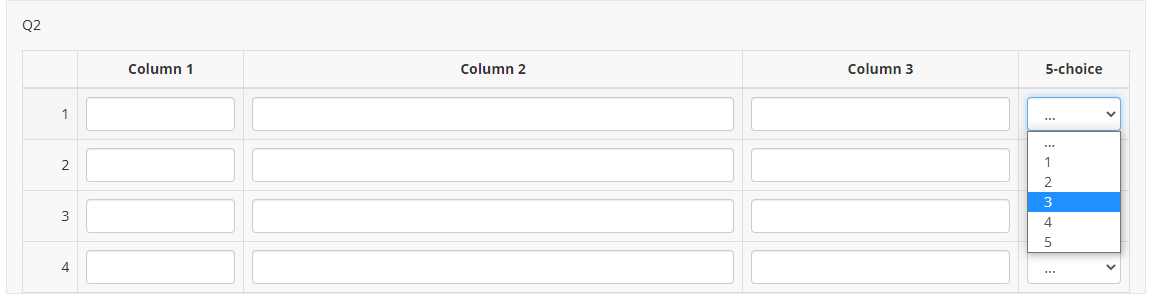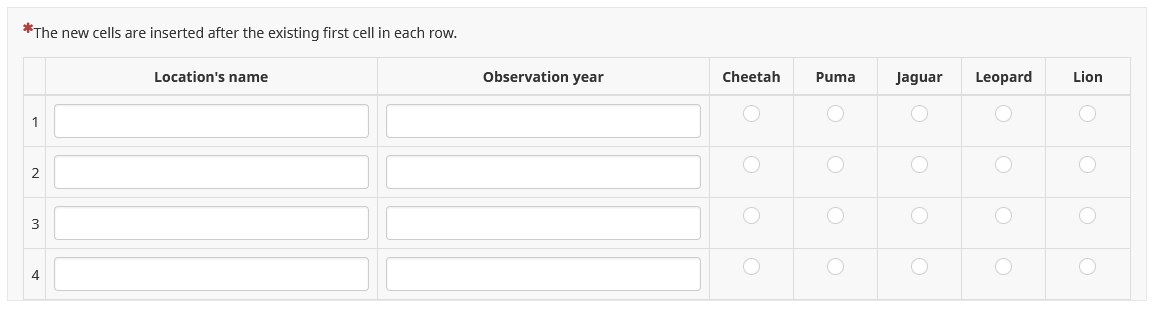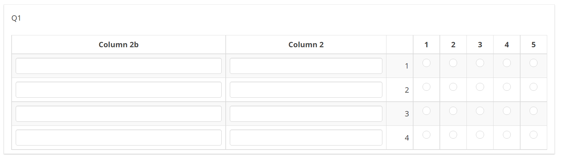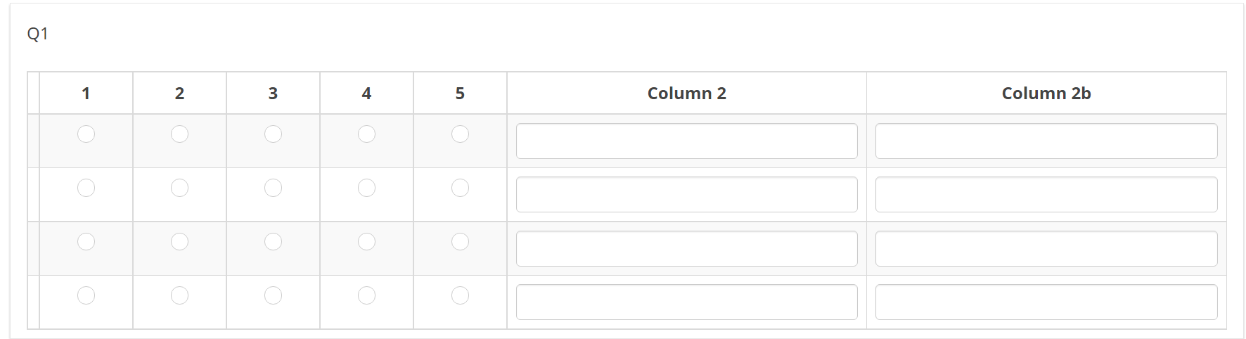 <script type="text/javascript" data-author="Tony Partner"> $(document).on('ready pjax:scriptcomplete',function(){ // Identify the questions var qArrayID = {QID}; var qArray = $('#question'+qArrayID); var qMultiText = qArray.nextAll('.multiple-short-txt:eq(0)'); var qMultiTextBis = qMultiText.nextAll('.multiple-short-txt:eq(0)'); // Hide the multi-short-text question $(qMultiText).hide(); $(qMultiTextBis).hide(); // Remove the core column widths $('table.questions-list col:not(.col-answers)', qArray).css('width', 'auto'); // Insert the header cells $('table.questions-list thead td:eq(0)', qArray).after('<th class="answer-text inserted-column-label" /></th><th class="answer-text-bis inserted-column-label-bis" /></th>'); $('.inserted-column-label, .inserted-column-label-bis', qArray).css('width','30%'); // Insert the answer row cells $('tr.answers-list', qArray).each(function(i) { $('.answertext', this).after('<td class="answer-item text-item"></td><td class="answer-item text-item-bis"></td>'); }); // Load the column label for the text inputs $('.inserted-column-label:eq(0)', qArray).text($('.ls-label-question', qMultiText).text()); $('.inserted-column-label-bis:eq(0)', qArray).text($('.ls-label-question', qMultiTextBis).text()); // Loop through the multi-short-text sub-questions $('li.answer-item', qMultiText).each(function(i) { // Move the text inputs into the array $('input[type="text"]', this).appendTo($('tr.answers-list:eq('+i+') .text-item', qArray)); }); $('li.answer-item', qMultiTextBis).each(function(i) { // Move the text inputs into the array $('input[type="text"]', this).appendTo($('tr.answers-list:eq('+i+') .text-item-bis', qArray)); }); }); </script>