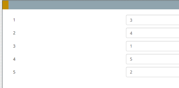 <script type="text/javascript" charset="utf-8"> function shuffle(array) { var currentIndex = array.length, temporaryValue, randomIndex; // While there remain elements to shuffle... while (0 !== currentIndex) { // Pick a remaining element... randomIndex = Math.floor(Math.random() * currentIndex); currentIndex -= 1; // And swap it with the current element. temporaryValue = array[currentIndex]; array[currentIndex] = array[randomIndex]; array[randomIndex] = temporaryValue; } return array; } $(document).on('ready pjax:scriptcomplete',function(){ // Fill the array var arr = []; for (var i = 1; i < 6; i++) { arr.push(i); } arr = shuffle(arr); $('#question{QID} input[type="text"]:eq(0)').val(arr[0]); $('#question{QID} input[type="text"]:eq(1)').val(arr[1]); $('#question{QID} input[type="text"]:eq(2)').val(arr[2]); $('#question{QID} input[type="text"]:eq(3)').val(arr[3]); $('#question{QID} input[type="text"]:eq(4)').val(arr[4]); // After testing remove the slashes of the next row to hide this question // $('#question{QID}').hide(); }); </script>