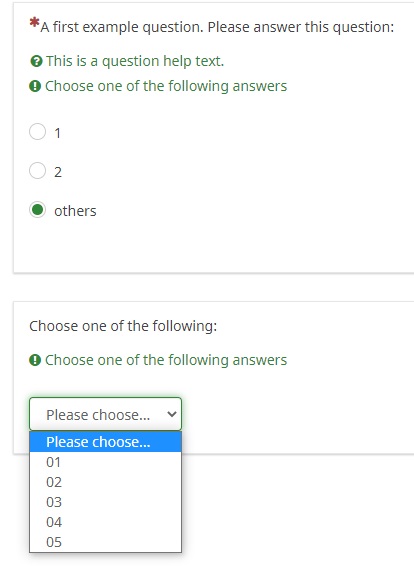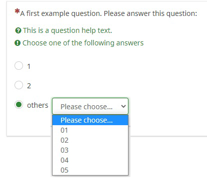 <script type="text/javascript" data-author="Tony Partner"> $(document).on('ready pjax:scriptcomplete',function(){ // The text for the "Please choose" option var chooseText = { 'en': 'Please choose...', 'de': 'Bitte auswählen...', 'fr': ' Veuillez choisir ...' } // Identify this question var qID = '{QID}'; var thisQuestion = $('#question'+qID); var nextQuestion = $(thisQuestion).nextAll('.list-dropdown:eq(0)'); var lang = $('html').attr('lang'); // Hide the next question nextQuestion.hide(); // Move the dropdown $('.answer-item.radio-item:last', thisQuestion).append($('.answer-item', nextQuestion)); // Cleanup styles $('.answer-item.radio-item .answer-item', thisQuestion).css({ 'display': 'inline-block', 'margin-left': '1em', 'padding': '0' }); function handleOther() { if($('.answer-item.radio-item:last :radio:checked', thisQuestion).length == 0) { $('.answer-item.radio-item .answer-item', thisQuestion).hide(); $('.answer-item.radio-item .answer-item input[type="hidden"]', thisQuestion).val(''); $('.answer-item.radio-item .answer-item select', thisQuestion).val('').trigger('change'); } else { $('.answer-item.radio-item .answer-item', thisQuestion).show(); } } // Initial state handleOther(); var iChooseText = chooseText['en']; if(lang in chooseText) { iChooseText = chooseText[lang]; } if($('select.form-control option[value=""]', thisQuestion).length == 0) { $('select.form-control', thisQuestion).prepend('<option value="">'+iChooseText+'</option>'); } // Listener on the radios $('.answer-item.radio-item :radio', thisQuestion).on('click', function(e) { handleOther(); }); }); </script>