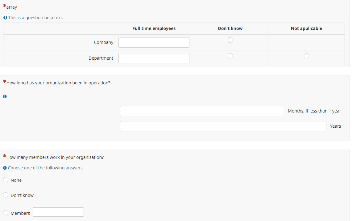<script type="text/javascript" charset="utf-8"> $(document).on('ready pjax:scriptcomplete',function(){ // Identify the questions var qArrayID = {QID}; var qArray = $('#question'+qArrayID); var qMultiText = qArray.nextAll('.multiple-short-txt:eq(0)'); // Hide the multi-short-text question $(qMultiText).hide(); var tableWidth = $('table.questions-list:eq(0)', qArray).width(); var answerWidth = $('col.ls-col-odd:eq(0)', qArray).width(); var answerWidthPercent = (answerWidth/tableWidth)*100; var answersLength = $('col.ls-col-odd, col.ls-col-even', qArray).length; var answerWidthPercent2 = (answerWidthPercent*answersLength)/(answersLength+1) $('table.questions-list col', qArray).removeAttr('width'); $('table.questions-list col:not(.col-answers)', qArray).css('width', 'auto'); $('table.questions-list thead tr', qArray).append( '<th class="answer-text inserted-column-label" /></th>'); $('table.questions-list thead tr th.answer-text.inserted-column-label', qArray).css('width','30%'); $('tr.answers-list', qArray).each(function(i) { $(this).append('<td class="answer-item text-item">\ </td>\ '); }); // Load the column label for the text inputs $('.inserted-column-label:eq(0)', qArray).text($('.ls-label-question', qMultiText).text()); $('.text-item', qArray).append('<label class="ls-label-xs-visibility">'+$('.ls-label-question', qMultiText).text()+'</label>'); // Loop through the multi-short-text sub-questions $('li.answer-item', qMultiText).each(function(i) { // Move the text inputs into the array $('input[type="text"]', this).appendTo($('tr.answers-list:eq('+i+') .text-item', qArray)); }); }); </script>