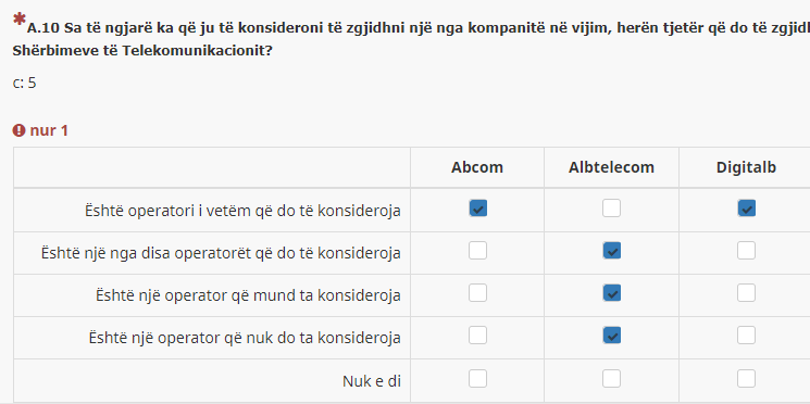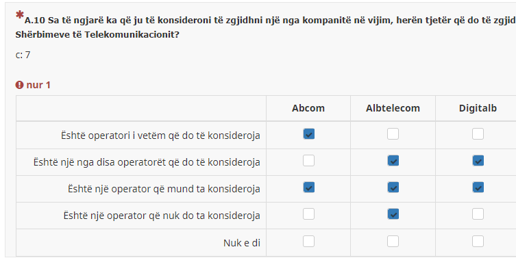 <script type="text/javascript" data-author="Tony Partner"> $(document).on('ready pjax:scriptcomplete',function(){ var thisQuestion = $('#question{QID}'); var firstRow = $('tr.subquestion-list:eq(0)', thisQuestion); // Listener on the first row checkboxes $(':checkbox', firstRow).on('change', function(e){ $(':checkbox', thisQuestion).prop('disabled', false); if($(this).is(':checked')) { var thisCell = $(this).closest('td'); var thisIndex = $(thisCell).index(); // Render this checkbox exclusive in this row var otherRowCells = $('td.answer-item', firstRow).not(thisCell); $(otherRowCells).each(function(i) { $('input[type="hidden"]', this).val(''); $(':checkbox', this).prop('checked', false).trigger('change'); }); // Render this checkbox exclusive in this column var otherColCells = $('td.answer-item:nth-child('+(thisIndex+1)+')').not(thisCell); $(otherColCells).each(function(i) { $('input[type="hidden"]', this).val(''); $(':checkbox', this).prop('checked', false).trigger('change').prop('disabled', true); }); } }); }); </script>