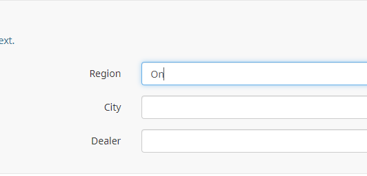 <script src="pathTo/jquery.easy-autocomplete.min.js"></script> <link href="pathTo/easy-autocomplete.min.css" rel="stylesheet" /> <script type="text/javascript" data-author="Tony Partner"> $(document).on('ready pjax:scriptcomplete',function(){ // Identify this question var thisQuestion = $('#question{QID}'); // Define the data var fullData = [ { 'region': 'Ontario', 'city': 'ONA1', 'dealer': 'ON11A1' }, { 'region': 'Ontario', 'city': 'ONA1', 'dealer': 'ON11A2' }, { 'region': 'Ontario', 'city': 'ONA1', 'dealer': 'ON11B1' }, { 'region': 'Ontario', 'city': 'ONA1', 'dealer': 'ON11B2' }, { 'region': 'Ontario', 'city': 'ONA2', 'dealer': 'ON12A1' }, { 'region': 'Ontario', 'city': 'ONA2', 'dealer': 'ON12A2' }, { 'region': 'Ontario', 'city': 'ONA2', 'dealer': 'ON12B1' }, { 'region': 'Ontario', 'city': 'ONA2', 'dealer': 'ON12B2' }, { 'region': 'Ontario', 'city': 'ONB1', 'dealer': 'ON21A1' }, { 'region': 'Ontario', 'city': 'ONB1', 'dealer': 'ON21A2' }, { 'region': 'Ontario', 'city': 'ONB1', 'dealer': 'ON21B1' }, { 'region': 'Ontario', 'city': 'ONB1', 'dealer': 'ON21B2' }, { 'region': 'Ontario', 'city': 'ONB2', 'dealer': 'ON22A1' }, { 'region': 'Ontario', 'city': 'ONB2', 'dealer': 'ON22A2' }, { 'region': 'Ontario', 'city': 'ONB2', 'dealer': 'ON22B1' }, { 'region': 'Ontario', 'city': 'ONB2', 'dealer': 'ON22B2' }, { 'region': 'Quebec', 'city': 'QCA1', 'dealer': 'QC11A1' }, { 'region': 'Quebec', 'city': 'QCA1', 'dealer': 'QC11A2' }, { 'region': 'Quebec', 'city': 'QCA1', 'dealer': 'QC11B1' }, { 'region': 'Quebec', 'city': 'QCA1', 'dealer': 'QC11B2' }, { 'region': 'Quebec', 'city': 'QCA2', 'dealer': 'QC12A1' }, { 'region': 'Quebec', 'city': 'QCA2', 'dealer': 'QC12A2' }, { 'region': 'Quebec', 'city': 'QCA2', 'dealer': 'QC12B1' }, { 'region': 'Quebec', 'city': 'QCA2', 'dealer': 'QC12B2' }, { 'region': 'Quebec', 'city': 'QCB1', 'dealer': 'QC21A1' }, { 'region': 'Quebec', 'city': 'QCB1', 'dealer': 'QC21A2' }, { 'region': 'Quebec', 'city': 'QCB1', 'dealer': 'QC21B1' }, { 'region': 'Quebec', 'city': 'QCB1', 'dealer': 'QC21B2' }, { 'region': 'Quebec', 'city': 'QCB2', 'dealer': 'QC22A1' }, { 'region': 'Quebec', 'city': 'QCB2', 'dealer': 'QC22A2' }, { 'region': 'Quebec', 'city': 'QCB2', 'dealer': 'QC22B1' }, { 'region': 'Quebec', 'city': 'QCB2', 'dealer': 'QC22B2' }, { 'region': 'Nova Scotia', 'city': 'NSA1', 'dealer': 'NS11A1' }, { 'region': 'Nova Scotia', 'city': 'NSA1', 'dealer': 'NS11A2' }, { 'region': 'Nova Scotia', 'city': 'NSA1', 'dealer': 'NS11B1' }, { 'region': 'Nova Scotia', 'city': 'NSA1', 'dealer': 'NS11B2' }, { 'region': 'Nova Scotia', 'city': 'NSA2', 'dealer': 'NS12A1' }, { 'region': 'Nova Scotia', 'city': 'NSA2', 'dealer': 'NS12A2' }, { 'region': 'Nova Scotia', 'city': 'NSA2', 'dealer': 'NS12B1' }, { 'region': 'Nova Scotia', 'city': 'NSA2', 'dealer': 'NS12B2' }, { 'region': 'Nova Scotia', 'city': 'NSB1', 'dealer': 'NS21A1' }, { 'region': 'Nova Scotia', 'city': 'NSB1', 'dealer': 'NS21A2' }, { 'region': 'Nova Scotia', 'city': 'NSB1', 'dealer': 'NS21B1' }, { 'region': 'Nova Scotia', 'city': 'NSB1', 'dealer': 'NS21B2' }, { 'region': 'Nova Scotia', 'city': 'NSB2', 'dealer': 'NS22A1' }, { 'region': 'Nova Scotia', 'city': 'NSB2', 'dealer': 'NS22A2' }, { 'region': 'Nova Scotia', 'city': 'NSB2', 'dealer': 'NS22B1' }, { 'region': 'Nova Scotia', 'city': 'NSB2', 'dealer': 'NS22B2' }, { 'region': 'Saskatchewan', 'city': 'SKA1', 'dealer': 'SK11A1' }, { 'region': 'Saskatchewan', 'city': 'SKA1', 'dealer': 'SK11A2' }, { 'region': 'Saskatchewan', 'city': 'SKA1', 'dealer': 'SK11B1' }, { 'region': 'Saskatchewan', 'city': 'SKA1', 'dealer': 'SK11B2' }, { 'region': 'Saskatchewan', 'city': 'SKA2', 'dealer': 'SK12A1' }, { 'region': 'Saskatchewan', 'city': 'SKA2', 'dealer': 'SK12A2' }, { 'region': 'Saskatchewan', 'city': 'SKA2', 'dealer': 'SK12B1' }, { 'region': 'Saskatchewan', 'city': 'SKA2', 'dealer': 'SK12B2' }, { 'region': 'Saskatchewan', 'city': 'SKB1', 'dealer': 'SK21A1' }, { 'region': 'Saskatchewan', 'city': 'SKB1', 'dealer': 'SK21A2' }, { 'region': 'Saskatchewan', 'city': 'SKB1', 'dealer': 'SK21B1' }, { 'region': 'Saskatchewan', 'city': 'SKB1', 'dealer': 'SK21B2' }, { 'region': 'Saskatchewan', 'city': 'SKB2', 'dealer': 'SK22A1' }, { 'region': 'Saskatchewan', 'city': 'SKB2', 'dealer': 'SK22A2' }, { 'region': 'Saskatchewan', 'city': 'SKB2', 'dealer': 'SK22B1' }, { 'region': 'Saskatchewan', 'city': 'SKB2', 'dealer': 'SK22B2' } ]; // Define some elements and vars var keys = ['region', 'city', 'dealer']; var input1 = $('.answer-item:eq(0) input:text.form-control', thisQuestion); var inputs = { 0: $('.answer-item:eq(0) input:text.form-control', thisQuestion), 1: $('.answer-item:eq(1) input:text.form-control', thisQuestion), 2: $('.answer-item:eq(2) input:text.form-control', thisQuestion) } var answers = { 0: $.trim($(inputs[0]).val()), 1: $.trim($(inputs[1]).val()), 2: $.trim($(inputs[2]).val()) } // Create an array of "region" values var regions = []; $.each(fullData, function(i, val) { if(!regions.includes(val.region)) { regions.push(val.region); } }); // Initiate autocomplete on the first input var aOptions1 = { data: regions, list: { maxNumberOfElements: 100, match: { enabled: true }, onChooseEvent: function() { //If new selection... if($.trim(inputs[0].val()) != answers[0]) { answers[0] = $.trim(inputs[0].val()); // Reset following items $('li.answer-item:gt(0) input:text', thisQuestion).val('').trigger('keyup').easyAutocomplete({ 'data': '' }); //Initiate autocomplete on next input childAutocomplete(0); } } } }; inputs[0].easyAutocomplete(aOptions1); function childAutocomplete(index) { if((index+1) < $('li.answer-item', thisQuestion).length) { var parentInput = inputs[index]; var nextInput = inputs[(index+1)]; var key1 = keys[index]; var key2 = keys[(index+1)]; // Define the new data var thisFullData = fullData.filter(function(obj) { return (obj[key1] == $.trim(parentInput.val())); }); var thisData = []; $.each(thisFullData, function(i, val) { if(!thisData.includes(val[key2])) { thisData.push(val[key2]); } }); //Init