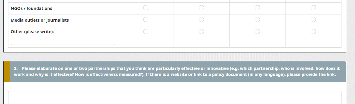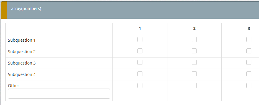 <script type="text/javascript" charset="utf-8"> $(document).ready(function() { // Identify the questions var thisQuestion = $('#question'+{QID}+''); var nextQuestion1 = $(thisQuestion).nextAll('.text-short:eq(0)'); var nextQuestions = $(nextQuestion1); var nextLength = nextQuestions.length; var sqLength = ('tr.answers-list', thisQuestion).length; // Hide the short-text questions $(nextQuestions).hide(); // Move the hidden text inputs into the array for (i = 0; i < nextLength; i++) { var workingIndex = (sqLength - 1) - (nextLength - i); var nextQ = nextQuestions[i]; $('th.answertext:eq('+workingIndex+')', thisQuestion).append($('input[type="text"]', nextQ)).closest('tr').addClass('otherRow'); } // Some styling... $('input[type="text"]', thisQuestion).css({ 'width': '100%' }); }); </script>