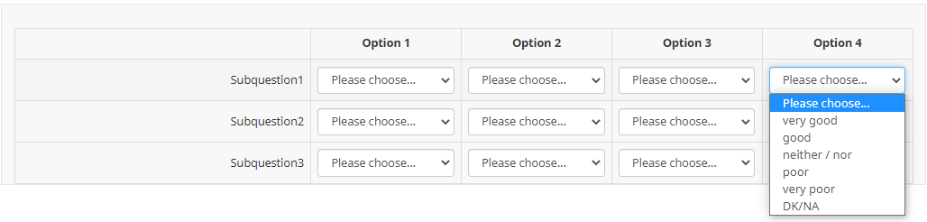 <script type="text/javascript" charset="utf-8"> $(document).on('ready pjax:scriptcomplete',function(){ var thisQuestion = $('#question{QID}'); // Insert selects $('.answer-item', thisQuestion).append('<select class="inserted-select form-control list-question-select">\ <option value="">Please choose...</option>\ <option value="1">very good</option>\ <option value="2">good</option>\ <option value="3">neither / nor</option>\ <option value="4">poor</option>\ <option value="5">very poor</option>\ <option value="6">DK/NA</option>\ </select>'); // Listeners $('.inserted-select', thisQuestion).on('change', function(i) { if($(this).val() != '') { $(this).closest('.answer-item').find('input:text').val($.trim($(this).val())).trigger('change'); } else { $(this).closest('.answer-item').find('input:text').val('').trigger('change'); } }); // Returning to page $('input:text', thisQuestion).each(function(i) { var thisCell = $(this).closest('.answer-item'); var inputVal = $.trim($(this).val()); $('select.inserted-select', thisCell).val(inputVal); }); // Clean-up styles $('select.inserted-select', thisQuestion).css({ 'max-width': '100%' }); $('input:text', thisQuestion).css({ 'position': 'absolute', 'left': '-9999em' }); }); </script>