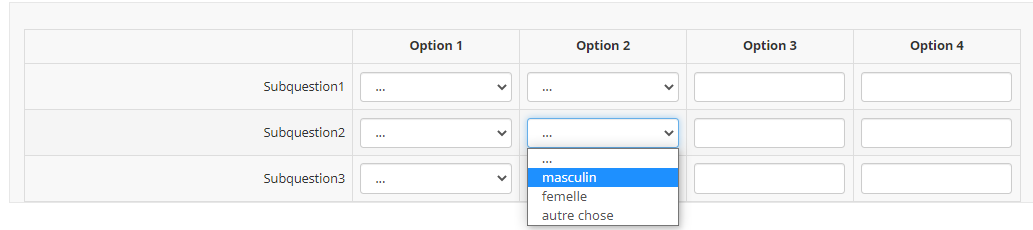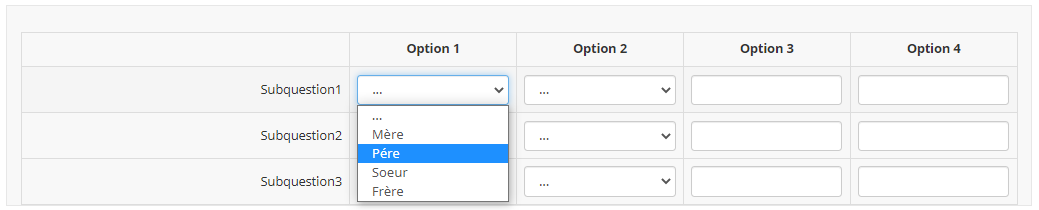 <script type="text/javascript" charset="utf-8"> $(document).on('ready pjax:scriptcomplete',function(){ var thisQuestion = $('#question{QID}'); // Insert selects $('.answer-item.answer_cell_X001', thisQuestion).addClass('with-select').append('<select class="inserted-select form-control list-question-select">\ <option value="">...</option>\ <option value="1">Mère</option>\ <option value="2">Pére</option>\ <option value="3">Soeur</option>\ <option value="4">Frère</option>\ </select>'); $('.answer-item.answer_cell_X002', thisQuestion).addClass('with-select').append('<select class="inserted-select form-control list-question-select">\ <option value="">...</option>\ <option value="1">masculin</option>\ <option value="2">femelle</option>\ <option value="3">autre chose </option>\ </select>'); // Listeners $('.inserted-select', thisQuestion).on('change', function(i) { if($(this).val() != '') { $(this).closest('.answer-item').find('input:text').val($('option:selected', this).val()).trigger('change'); } else { $(this).closest('.answer-item').find('input:text').val('').trigger('change'); } }); // Returning to page $('.with-select input:text', thisQuestion).each(function(i) { var thisCell = $(this).closest('.answer-item'); var inputText = $.trim($(this).val()); $('select.inserted-select', thisCell).val(inputText); }); // Clean-up styles $('select.inserted-select', thisQuestion).css({ 'max-width': '100%' }); $('.with-select input:text', thisQuestion).css({ 'position': 'absolute', 'left': '-9999em' }); }); </script>