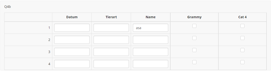 <script type="text/javascript" data-author="Tony Partner"> $(document).on('ready pjax:scriptcomplete',function(){ // Identify the questions var qArrayID = {QID}; var qArray = $('#question'+qArrayID); var qMultiText = qArray.nextAll('.multiple-short-txt:eq(0)'); var qMultiTextBis = qMultiText.nextAll('.multiple-short-txt:eq(0)'); var qMultiTextTre = qMultiText.nextAll('.multiple-short-txt:eq(1)'); // Hide the multi-short-text question $(qMultiText).hide(); $(qMultiTextBis).hide(); $(qMultiTextTre).hide(); // Remove the core column widths $('table.questions-list col:not(.col-answers)', qArray).css('width', 'auto'); // Insert the header cells $('table.questions-list thead td:eq(0)', qArray).after('<th class="answer-text inserted-column-label" /></th><th class="answer-text-bis inserted-column-label-bis" /></th><th class="answer-text-bis inserted-column-label-tre" /></th>'); $('.inserted-column-label, .inserted-column-label-bis, .inserted-column-label-tre', qArray).css('width','15%'); // Insert the answer row cells $('tr.subquestion-list', qArray).each(function(i) { $('.answertext', this).after('<td class="answer-item text-item"></td><td class="answer-item text-item-bis"></td><td class="answer-item text-item-tre"></td>'); }); // Load the column label for the text inputs $('.inserted-column-label:eq(0)', qArray).text($('.ls-label-question', qMultiText).text()); $('.inserted-column-label-bis:eq(0)', qArray).text($('.ls-label-question', qMultiTextBis).text()); $('.inserted-column-label-tre:eq(0)', qArray).text($('.ls-label-question', qMultiTextTre).text()); // Loop through the multi-short-text sub-questions $('li.answer-item', qMultiText).each(function(i) { // Move the text inputs into the array $('input[type="text"]', this).appendTo($('tr.subquestion-list:eq('+i+') .text-item', qArray)); }); $('li.answer-item', qMultiTextBis).each(function(i) { // Move the text inputs into the array $('input[type="text"]', this).appendTo($('tr.subquestion-list:eq('+i+') .text-item-bis', qArray)); }); $('li.answer-item', qMultiTextTre).each(function(i) { // Move the text inputs into the array $('input[type="text"]', this).appendTo($('tr.subquestion-list:eq('+i+') .text-item-tre', qArray)); }); }); </script>