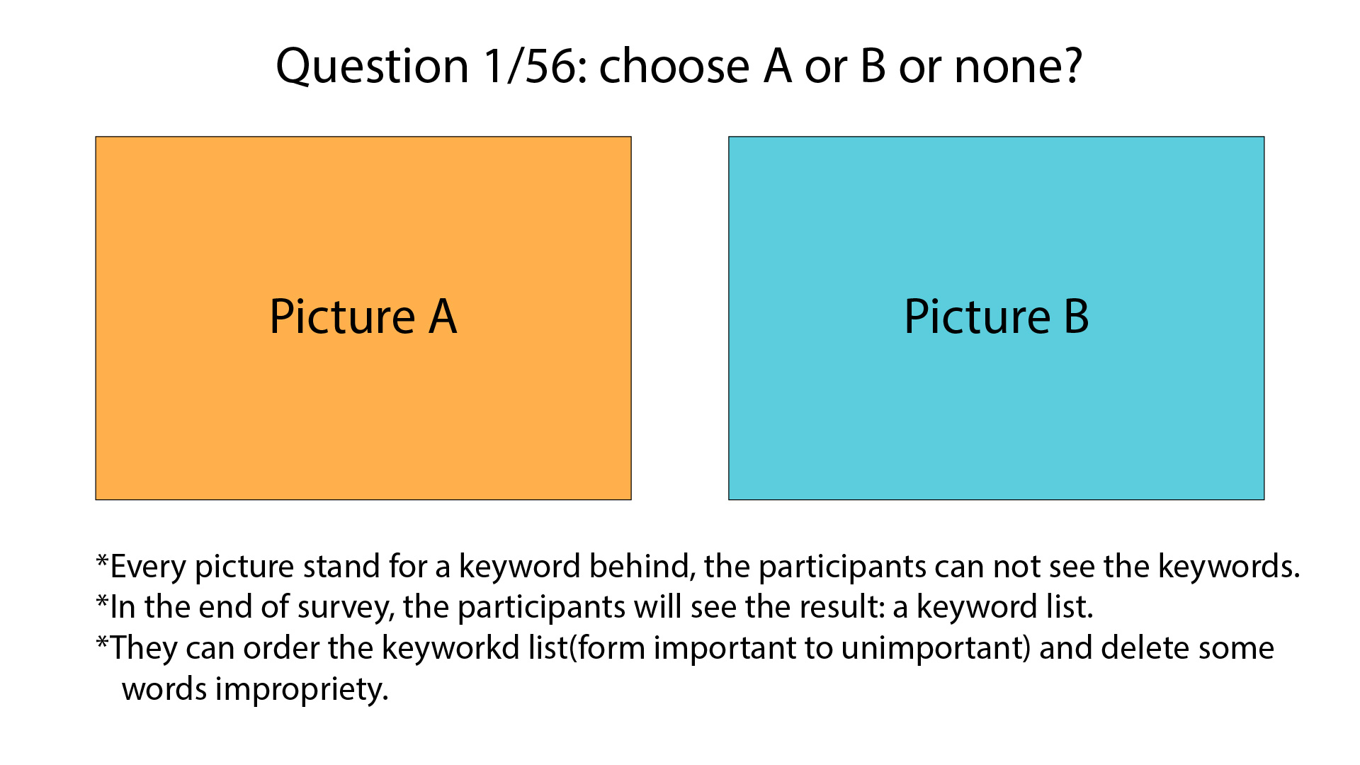 I showed you already how the answer options of your ranking questions look like.3. The interface looks right, but I don't know how to link picture with keyword. Anyone can guide more precisely?
