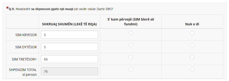 <script type="text/javascript" data-author="Tony Partner"> $(document).on('ready pjax:scriptcomplete',function(){ // Identify this question var q1ID = '{QID}'; var thisQuestion = $('#question'+q1ID); //Identify the inputs var activeInputs = $('tr[id^="javatbd"]:not(:last) .answer-item:nth-child(2) input:text.form-control', thisQuestion); var totalInput = $('tr[id^="javatbd"]:last .answer-item:nth-child(2) input:text.form-control', thisQuestion); // Render the text input in the last row readonly $('tr[id^="javatbd"]:last .answer-item:nth-child(2) input:text', thisQuestion).prop('readonly', true); // Listener on the text inputs in first coloumn, except last row $(activeInputs).on('keyup change', function(e) { var thisValue = $.trim($(this).val()); // Strip out non-numerics characters newValue = thisValue.replace(/\D/g,'').replace(/,/g,'').replace(/\./g,''); $(this).val(newValue); // Load the total into the last row var total = 0; $(activeInputs).each(function(i) { total = total + Number($(this).val()); }); $(totalInput).val(total).trigger('change') }); }); </script>