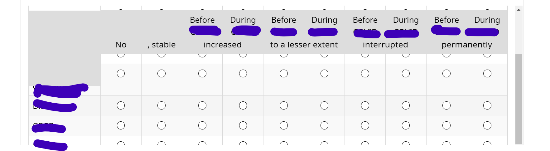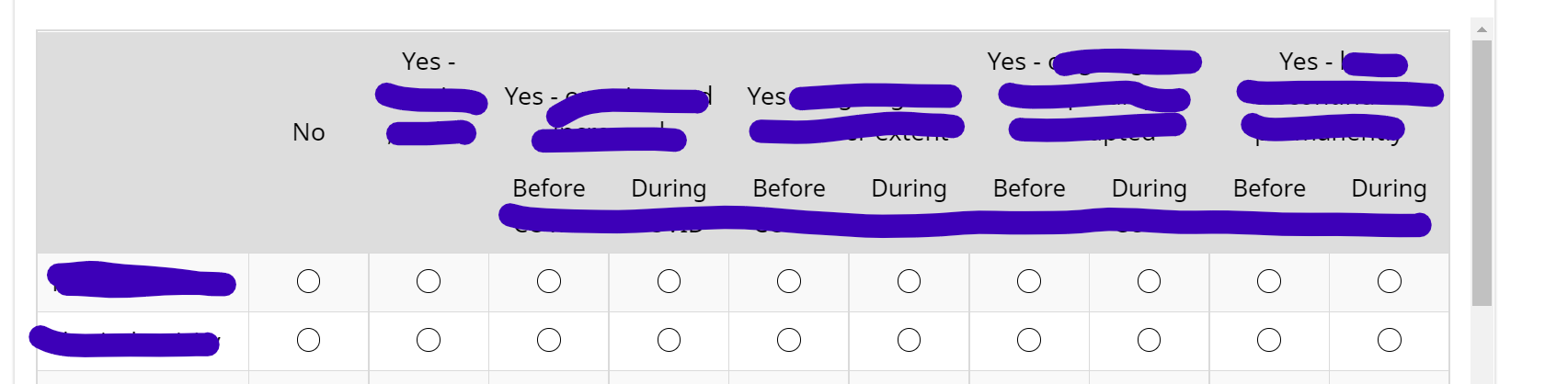 <style data-author="Tony Partner" type="text/css"> @media only screen and (min-width: 768px) { #question{QID} .answer-container { position: relative; max-height: 300px; overflow: scroll; } #question{QID} table.subquestion-list { text-align: left; position: relative; border-collapse: collapse; } #question{QID} table.subquestion-list thead { position: sticky; top: 1px; z-index: 1000; } #question{QID} table.subquestion-list thead th, #question{QID} table.subquestion-list thead td { background: #DDDDDD; border: 0 none; box-shadow: -1px 0 #000000, 0 1px #000000, 1px 0 #000000, 0 -1px #000000; } #question{QID} table.subquestion-list .ls-heading-repeat { display: none; } } </style>