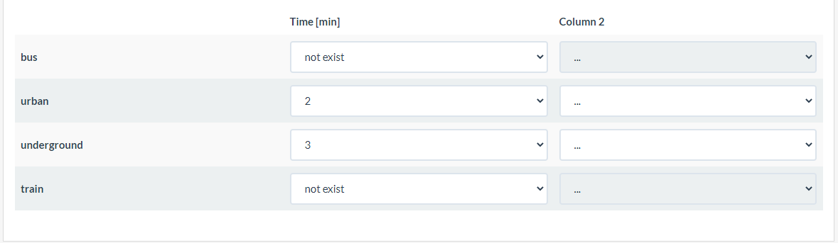 I have a question, where I ask to indicate the walking time to different stops of public transport. For each stop the participant will indicate the minutes of walking. There is also an "other" option, that indicates, that there is no stop accessible. I added a Screenshot of the question for better understanding.
