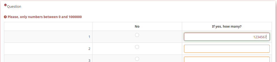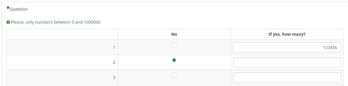 So, either the cell of the first subquestion is empty (if answered "No") or it is (greater or equal 0 and less or equal 1000000)