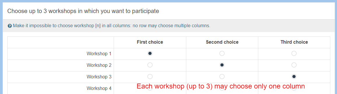 using normal Array this does not work either. I can still choose for 1 workshop "first choice" as well as "second choice" as well as "third choice"