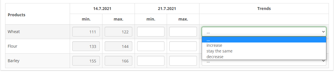 <script type="text/javascript" charset="utf-8"> $(document).on('ready pjax:scriptcomplete',function(){ // Insert the column categories $('#question{QID} table.subquestion-list thead tr:eq(0) td:eq(0)').remove(); $('#question{QID} table.subquestion-list thead').prepend('<tr class="ls-heading">\ <td rowspan="2" colspan="1" style="border-top:0 !important;font-weight:bold;padding-top:30px;">Products</td>\ <th class="answer-text inserted-header" colspan="2">14.7.2021</th>\ <th class="answer-text inserted-header" colspan="2">21.7.2021</th>\ <th class="answer-text inserted-header" colspan="1">Trends</th>\ </tr>'); }); </script>