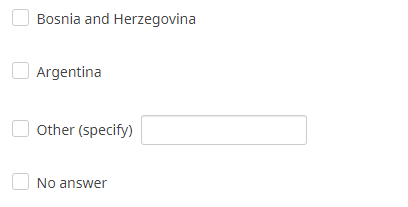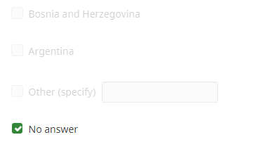 - "No answer" in "nationality should be exclusive and better at the end, below "Other, specify"