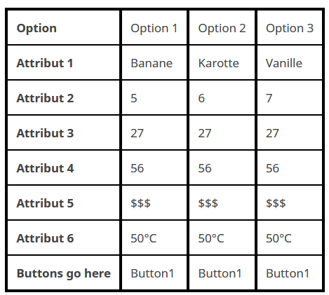 <table id="dce_table"> </table> <script type="text/javascript" charset="utf-8"> $(document).on('ready pjax:scriptcomplete',function(){ var myData = [ { "Version":"1","Task":"1","Concept":"1","Att1":"Banane","Att2":"5€","Att3":"27,56","Att4":"$$$","Att5":"50°C"}, { "Version":"1","Task":"1","Concept":"2","Att1":"Karotte","Att2":"10€","Att3":"58,87","Att4":"€€€","Att5":"165°F"}, { "Version":"1","Task":"1","Concept":"3","Att1":"Vanilleeis","Att2":"10€","Att3":"58,87","Att4":"€€€","Att5":"165°F"}, { "Version":"1","Task":"2","Concept":"1","Att1":"Birne","Att2":"5€","Att3":"27,56","Att4":"$$$","Att5":"50°C"}, { "Version":"1","Task":"2","Concept":"2","Att1":"Sellerie","Att2":"10€","Att3":"58,87","Att4":"€€€","Att5":"165°F"}, { "Version":"1","Task":"2","Concept":"3","Att1":"Obstsalat","Att2":"10€","Att3":"58,87","Att4":"€€€","Att5":"165°F"}, { "Version":"2","Task":"1","Concept":"1","Att1":"Apfel","Att2":"5€","Att3":"27,56","Att4":"$$$","Att5":"50°C"}, { "Version":"2","Task":"1","Concept":"2","Att1":"Gurke","Att2":"10€","Att3":"58,87","Att4":"€€€","Att5":"165°F"}, { "Version":"2","Task":"1","Concept":"3","Att1":"Mousse au Chocolat","Att2":"10€","Att3":"58,87","Att4":"€€€","Att5":"165°F"}, { "Version":"2","Task":"2","Concept":"1","Att1":"Blaubeeren","Att2":"5€","Att3":"27,56","Att4":"$$$","Att5":"50°C"}, { "Version":"2","Task":"2","Concept":"2","Att1":"Zucchini","Att2":"10€","Att3":"58,87","Att4":"€€€","Att5":"165°F"}, { "Version":"2","Task":"2","Concept":"3","Att1":"Erdbeerjoghurt","Att2":"10€","Att3":"58,87","Att4":"€€€","Att5":"165°F"} ] // THIS IS WHAT I IMAGINED COULD WORK BUT IT DOESN'T: //var surveyID = 123456; //var filename = 'path/to/file/filename.txt'; //var myData = JSON.parse(filename); var attributes = ["Attribut 1", "Attribut 2", "Attribut 3","Attribut 4", "Attribut 5"]; var myTASK = "1"; var alternatives = ["Option 1","Option 2","Option 3"]; var myVERSION = "2"; // replace with random number (generated on earlier page) later on var h = 0; var f = 0; // Check number of columns to be created var col = ; col.push("Option"); for (var key in myData[0]) { if (key != "Version" && key != "Task" && key != "Concept") { col.push(key); } } col.push("Buttons"); var table = document.createElement("table"); var tr = table.insertRow(-1); // Create table headers for (var i = 0; i < col.length; i++) { if (i === 0) { var th = document.createElement("th"); th.innerHTML = "Option"; tr.appendChild(th); } else if (i < col.length-1) { var th = document.createElement("th"); th.innerHTML = attributes[i-1]; tr.appendChild(th); } else { var th = document.createElement("th"); th.innerHTML = "Auswahl"; tr.appendChild(th); } } // Create rows for (var i = 0; i < myData.length; i++) { if (myData[i]["Version"] === myVERSION && myData[i]["Task"] === myTASK) { tr = table.insertRow(-1); for (var j = 0; j < col.length; j++) { if (col[j] === "Buttons") { tr.insertCell(-1); } else if (j == 0) { var createLabel = tr.insertCell(-1); createLabel.innerHTML = alternatives[f]; f += 1; } else { var tabCell = tr.insertCell(-1); tabCell.innerHTML = myData[i][col[j]]; } } } } var divContainer = document.getElementById("dce_table"); divContainer.innerHTML = ""; divContainer.appendChild(table); });[/i][/i][/i]