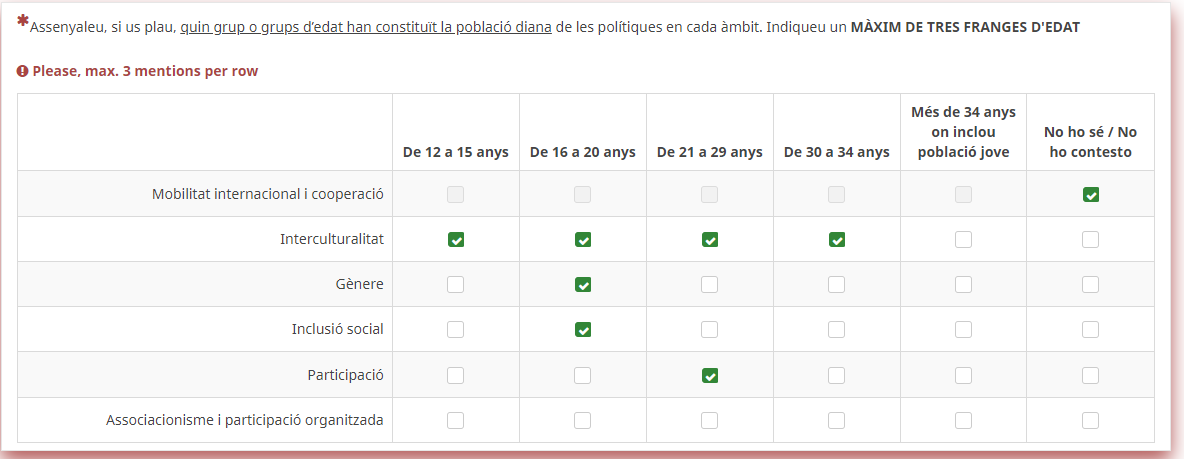 <script type="text/javascript" data-author="Tony Partner"> $(document).on('ready pjax:scriptcomplete',function(){ var thisQuestion = $('#question{QID}') // Add some classes to the checkbox cells $('td.checkbox-item', thisQuestion).addClass('normal-item'); $('tr.subquestion-list', thisQuestion).each(function(i) { $('.normal-item:last', this).removeClass('normal-item').addClass('exclusive-item') }); // A listener on the checkboxes $('input[type="checkbox"]', thisQuestion).on('change', function (event) { handleCheckboxes($(this)); }); function handleCheckboxes(thisInput) { var thisCell = $(thisInput).closest('td'); var thisRow = $(thisCell).closest('tr'); $('input[type="checkbox"]', thisRow).prop('disabled', false); $('td', thisRow).closest('td').removeClass('checked-item'); $('input[type="checkbox"]:checked', thisRow).closest('td').addClass('checked-item'); // Exclusive item if($('.exclusive-item input[type="checkbox"]:eq(0)', thisRow).is(':checked')) { $('.normal-item input[type="hidden"]', thisRow).val(''); $('.normal-item input[type="checkbox"]', thisRow).prop('checked', false).prop('disabled', true); } else { $('.exclusive-item input[type="hidden"]', thisRow).val(''); $('.exclusive-item input[type="checkbox"]', thisRow).prop('checked', false); } // Max 3 answers per row if($('input[type="checkbox"]:checked', thisRow).length == 3) { $('td:not(.exclusive-item):not(.checked-item)', thisRow).find('input[type="checkbox"]').prop('disabled', true); } // Check conditions (relevance) $('td.checkbox-item', thisRow).each(function(i) { var thisValue = ''; if($('input[type="checkbox"]', this).is(':checked')) { thisValue = 1; } var thisSGQA = $('input[type="checkbox"]', this).attr('id').replace(/cbox_/, ''); $('input[type="hidden"]', this).attr('value', thisValue); fixnum_checkconditions(thisValue, thisSGQA, 'hidden'); }); } }); </script>