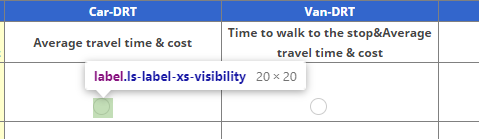 <thead> <tr> <th class="header1" colspan="3" style="width: 50%;">Reported trip</th> <th class="header1" scope="col" style="width: 25%;">Car-DRT</th> <th class="header1" scope="col" style="width: 25%;">Van-DRT</th> </tr> </thead> <tbody> <tr> <td class="tdyellow" style="width: 24%;">Trip segment</td> <td class="tdyellow" style="width: 13%;">reported mode(s)</td> <td class="tdyellow" style="width: 13%;">Reported duration&Cost</td> <td class="tdtrans">Average travel time & cost</td> <td class="tdtrans">Time to walk to the stop<br />Average travel time & cost</td> </tr> <tr style="{if(t1pre==0,'display:none;','')}"> <td class="tdyellow">A</td> <td class="tdyellow"> </td> ....
