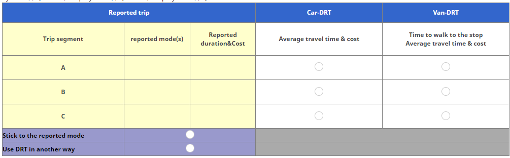 <thead> <tr> <th class="header1" colspan="3" style="width: 50%;">Reported trip</th> <th class="header1" scope="col" style="width: 25%;">Car-DRT</th> <th class="header1" scope="col" style="width: 25%;">Van-DRT</th> </tr> </thead> <tbody> <tr> <td class="tdyellow" style="width: 24%;">Trip segment</td> <td class="tdyellow" style="width: 13%;">reported mode(s)</td> <td class="tdyellow" style="width: 13%;">Reported duration&Cost</td> <td class="tdtrans">Average travel time & cost</td> <td class="tdtrans">Time to walk to the stop<br />Average travel time & cost</td> </tr> <tr style="{if(t1pre==0,'display:none;','')}"> <td class="tdyellow">A</td> <td class="tdyellow"> </td> ....