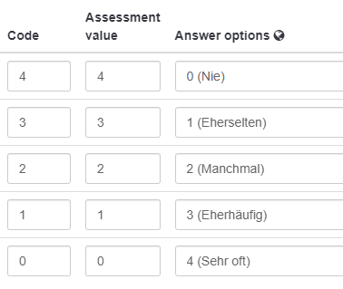 So in this group I have 2 Array questions. First question has different code(value) for answers and the second question has different. So to say, in Array1 "Sehr oft" has code 4 and in Array2 "sehr oft" has code 1. Now I want to merge 2nd array in the first one (as I added one question of Array2 into Array1 marked by revers). I hope I was precise.