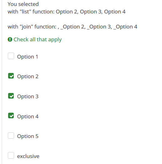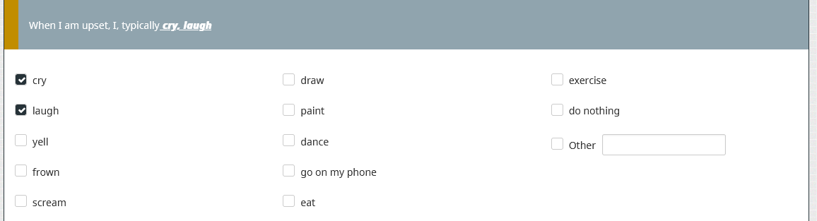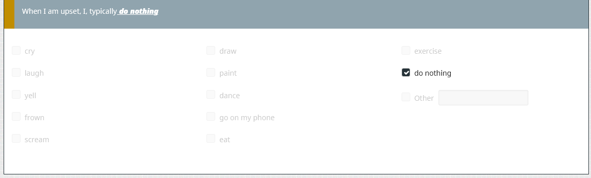 My goal with this question (GEW2) is to have participants select as many options as they would like, and their responses will fill in the blank within the question stem (e.g., "When I am upset, I, typically, _____" and their responses would create a list). The code I have been using so far works great.... until I set an exclusive option for an option that would contradict the rest (e.g., "do nothing"). When this option is selected, I want the question stem to act as it does with the other options (e.g., "When I am upset, I, typically, do nothing.") but once I set it as exclusive, it stops working. I noticed that when I set it to exclusive and the option is selected, part of the question stem seems to disappear (specifically, it seems to default to "__." which is no where in the question stem or coding).