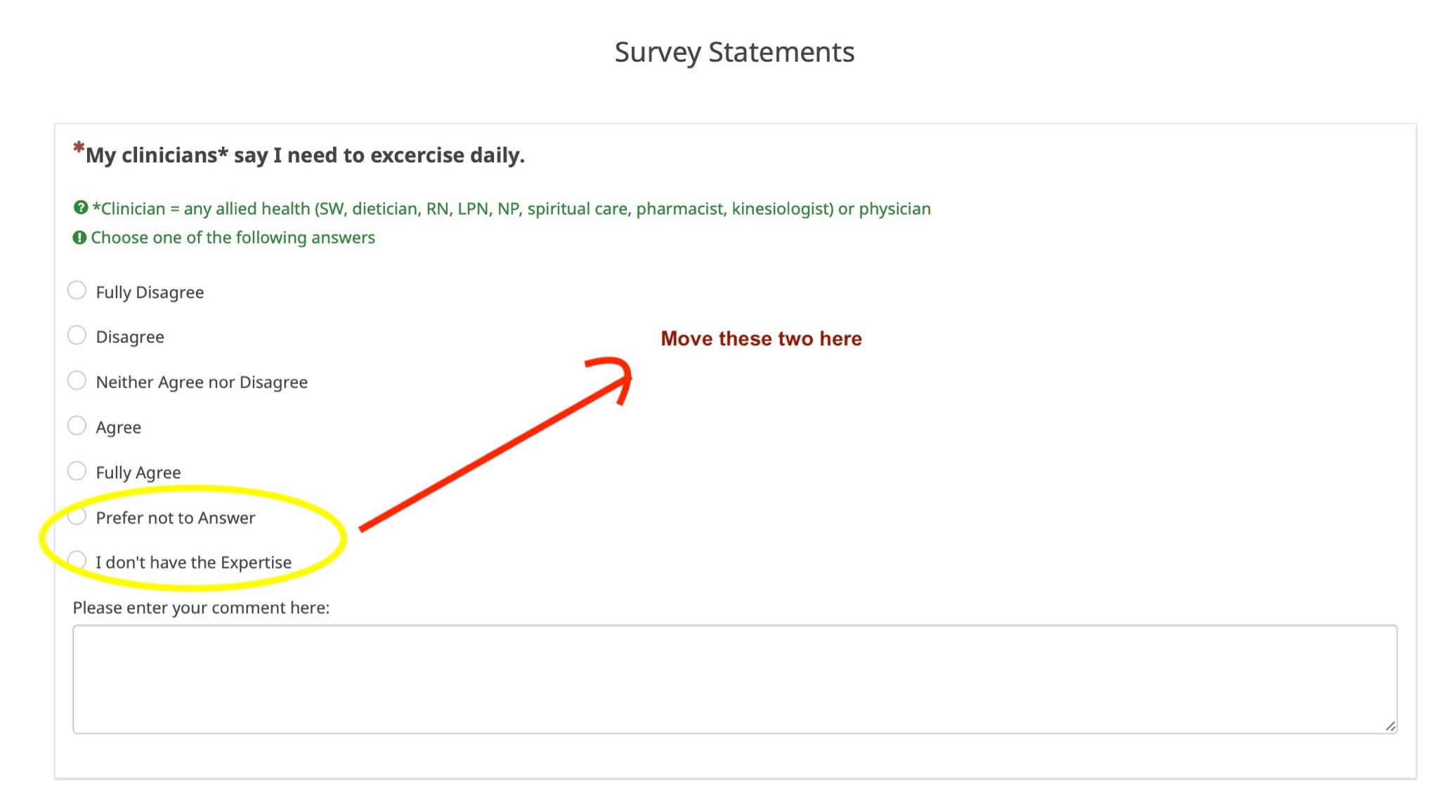 <script type="text/javascript" data-author="Tony Partner"> $(document).on('ready pjax:scriptcomplete',function(){ // Number of items to move into the second column var moveNumber = 2; // Identify this question var thisQuestion = $('#question6646'); // Move the textarea below the radios $('.answer-item.text-item, answers-list radio-list', thisQuestion).removeClass('col-sm-6'); // Insert a new column $('.answer-item.text-item', thisQuestion).after('<div class="answers-list radio-list col-xs-12">\ <ul class="list-unstyled" role="radiogroup"></ul>\ </div>'); // Move the items var itemsLength = $('.radio-item', thisQuestion).length; $('.radio-item:gt('+(itemsLength-moveNumber-1)+')', thisQuestion).appendTo($('.answers-list.radio-list:eq(1) ul:eq(0)', thisQuestion)); }); </script>