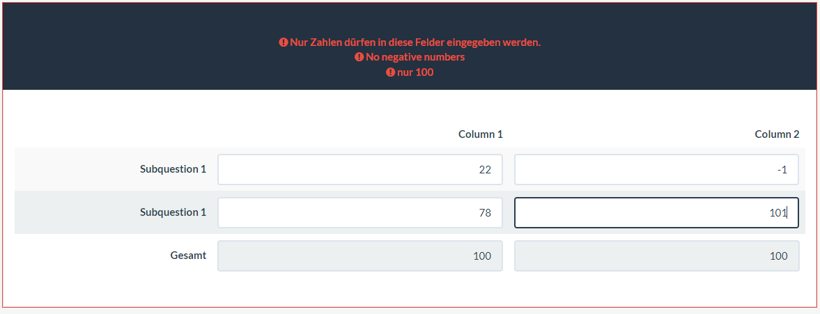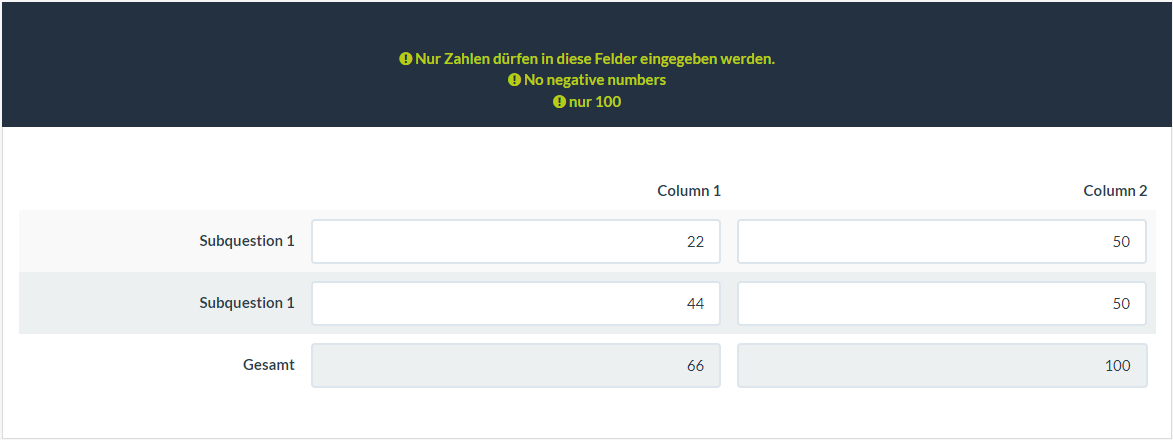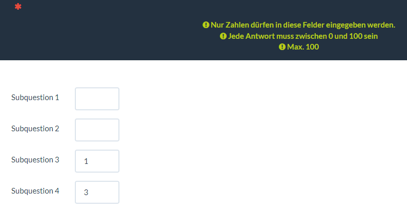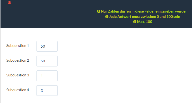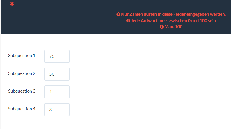 Hi people, this time i have a multiple numerical input that i need to check thw SQ001 and SQ002 dont exceed 100, empty or 0 is valid too because is an optional question, the same with SQ003 and SQ004.