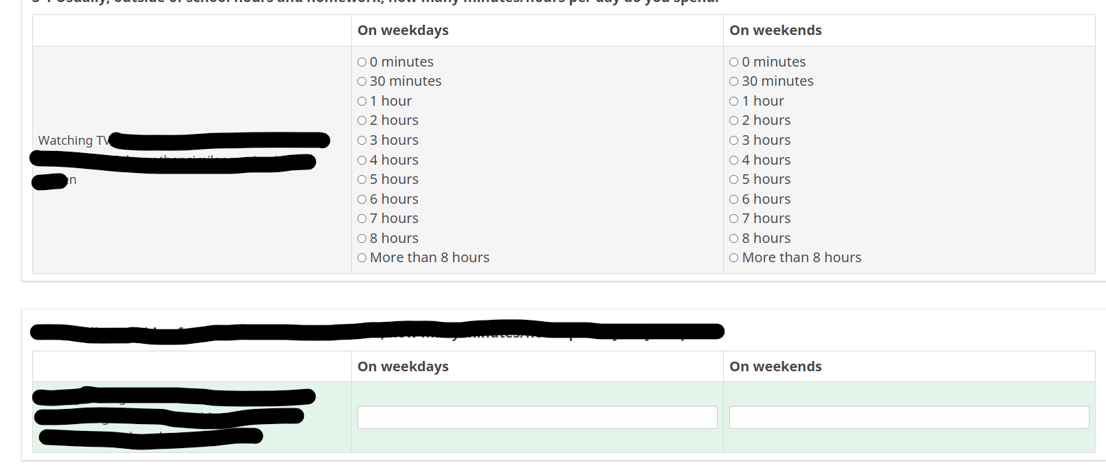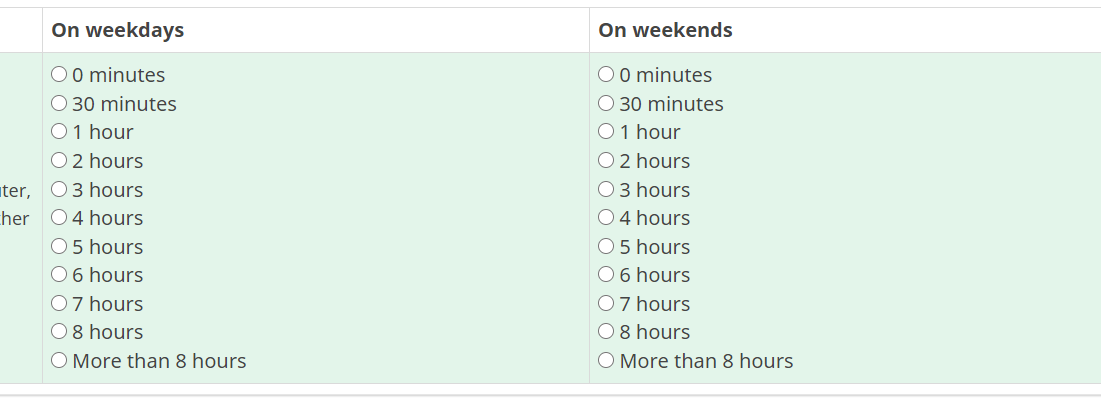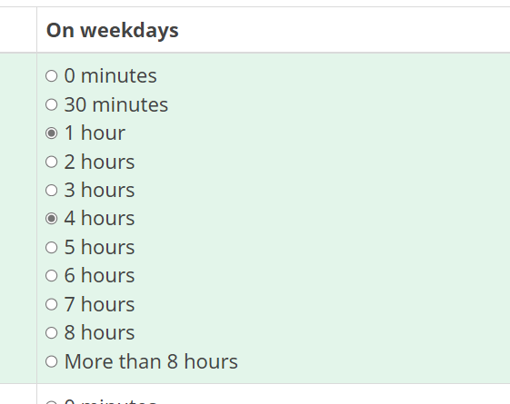 <span onclick="checkClosest(this)"> <input value="5" class="inserted-radio" type="radio" name="radio_" id="radio-5" /> 3 hours</span><br />\ <span onclick="checkClosest(this)"> <input value="6" class="inserted-radio" type="radio" name="radio" id="radio-6" /> 4 hours</span><br />\ <span onclick="checkClosest(this)"> <input value="7" class="inserted-radio" type="radio" name="radio" id="radio-7" /> 5 hours</span><br />\ <span onclick="checkClosest(this)"> <input value="8" class="inserted-radio" type="radio" name="radio" id="radio-8" /> 6 hours</span><br />\ <span onclick="checkClosest(this)"> <input value="9" class="inserted-radio" type="radio" name="radio" id="radio-9" /> 7 hours</span><br />\ <span onclick="checkClosest(this)"> <input value="10" class="inserted-radio" type="radio" name="radio" id="radio-10" /> 8 hours</span><br />\ <span onclick="checkClosest(this)"> <input value="12" class="inserted-radio" type="radio" name="radio_" id="radio-12" /> More than 8 hours</span><br />\
