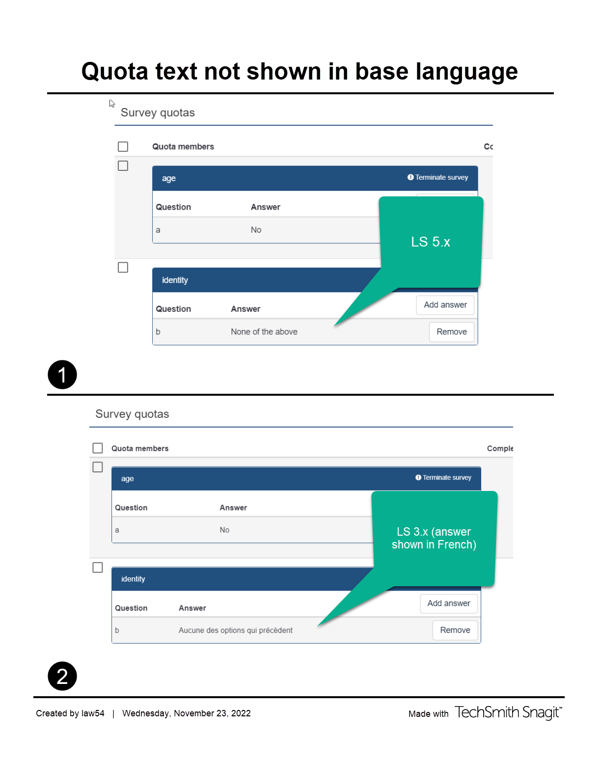 When setting up quotas in a multi-lingual survey, the language of the sub-questions isn't shown in the base language. For example, I have a survey with a base language of English, and second language of French -- and when setting up a quota, the sub-question text is shown in French: