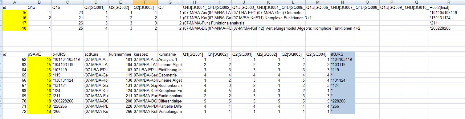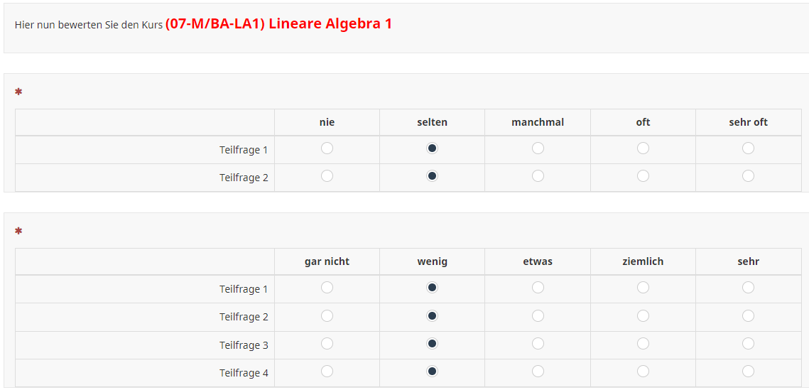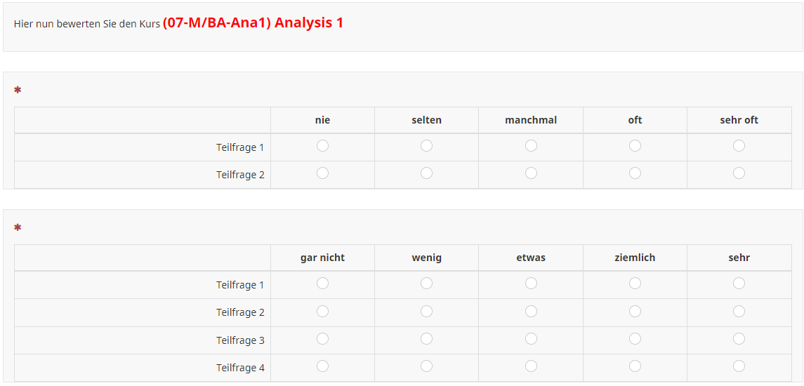 b. The courses themselves: about 10 questions with the same structure (e.g. "The lecturer gives space for discussion of topics" - with again Likert-scale like "way too much" over "perfectly balanced" to "way too low".