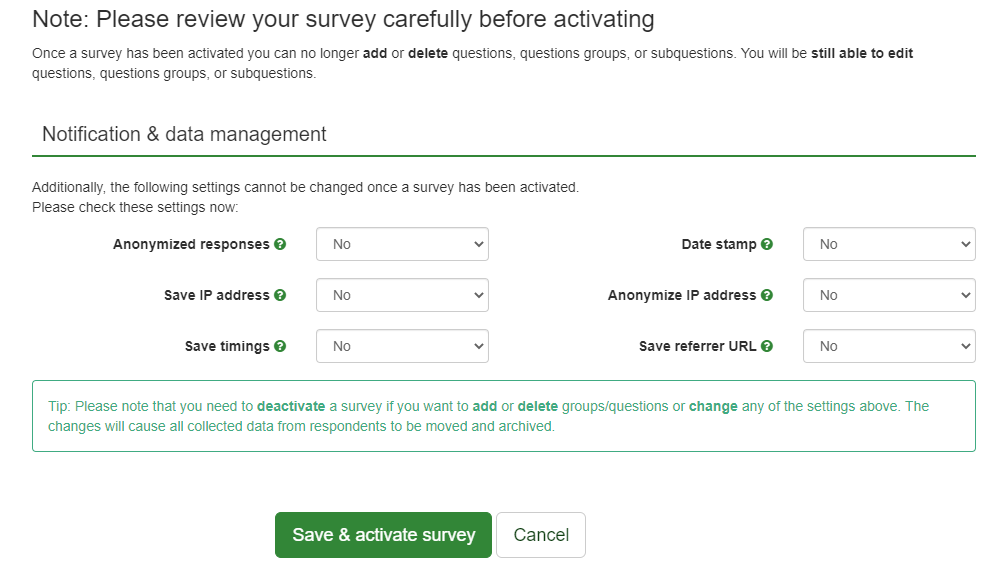 Note: When deactivating the survey, the response table with the already collected responses so far will be archived. Usually, upon reactivating you can import this old response table again (but of course you won't have any IP addresses for the responses collected before you change the setting). However, I personally download the responses collected so far, just to be save. What you have, you have. If something goes wrong, you can join the different data files later outside of Limesurvey. I like to play it save.