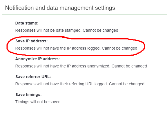 This is what you see on the "Notifications & Data" page of your survey when you did not tell Limesurvey to save the IP address upon activating.