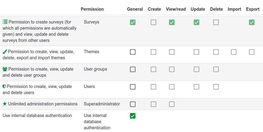 I need to check only in two rows of permissions. One is "Permission to create surveys" and there I need to check "View/Read" and "Export" - so that I can download the data. If I want to be able to modify or insert responses with this account, I also need to tick "Update" permission in this row.