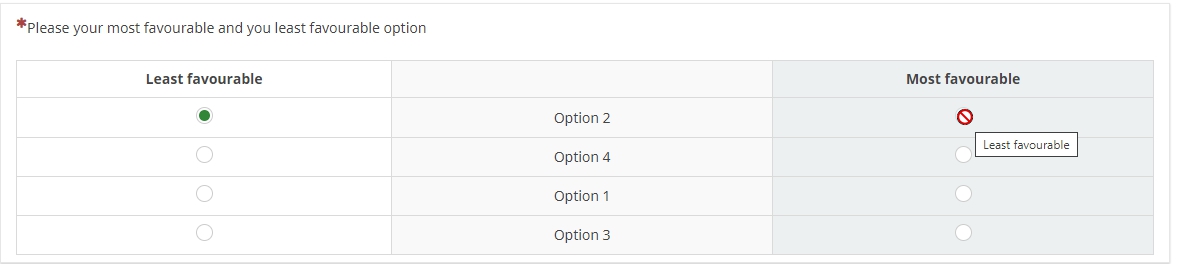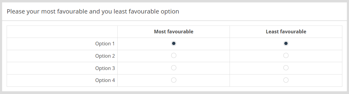 <script type="text/javascript" charset="utf-8"> function maxDiff(qID, randomize) { // Identify some elements var thisQuestion = $('#question'+qID); var thisTable = $('table.subquestion-list:eq(0)', thisQuestion); // Assign a new question class $(thisQuestion).addClass('max-diff-array'); // Move the columns $('thead tr:eq(0)', thisTable).prepend($('thead tr:eq(0) th:eq(1)', thisTable)); $('tr.answers-list', thisTable).each(function(i){ $('td.answer-item:eq(0)', this).prependTo(this); }); // Random rows if(randomize) { var rowsArr = []; $('tr.answers-list', thisTable).each(function(i){ $(this).attr('data-index', i); rowsArr.push(i); }); shuffleArray(rowsArr); $(rowsArr).each(function(i){ $('tbody', thisTable).append($('tr[data-index="'+this+'"]', thisTable)); }); } // Prevent clicking twice in the same row $('input[type="radio"]', thisQuestion).on('click', function () { $('input[type="radio"]', thisQuestion).prop('disabled', false); $('input[type="radio"]:checked', thisQuestion).each(function(i) { var thisRow = $(this).closest('tr.answers-list'); $('input[type="radio"]', thisRow).not(this).prop('disabled', true); }); }); // Fix up the row classes var rowClass = 1; $('tr.answers-list', thisTable).each(function(i) { $(this).addClass('array'+(2-(i%2))); }); } function shuffleArray(array) { for (var i = array.length - 1; i > 0; i--) { var j = Math.floor(Math.random() * (i + 1)); var temp = array[i]; array[i] = array[j]; array[j] = temp; } return array; } $(document).ready(function(){ // Call the maxDiff() function // Set the second parameter to true for randomized rows maxDiff({QID}, true); }); </script> <style type="text/css">.ls-answers tbody .answertext{ text-align:center !important; } </style>