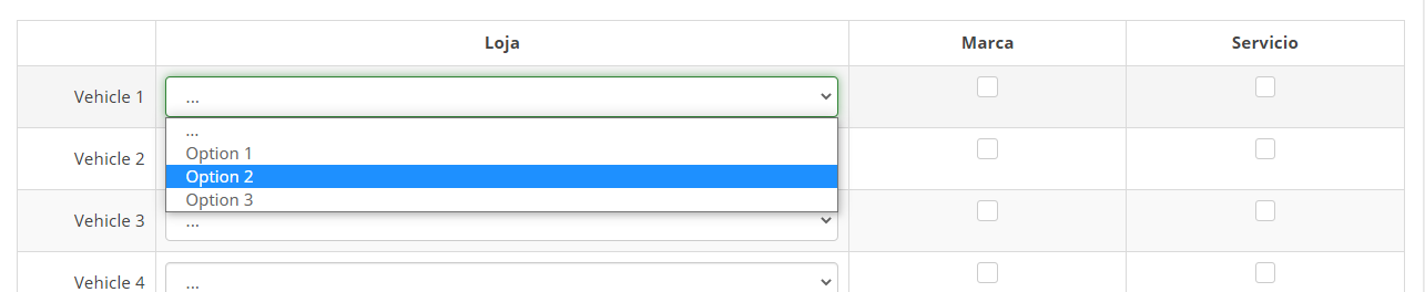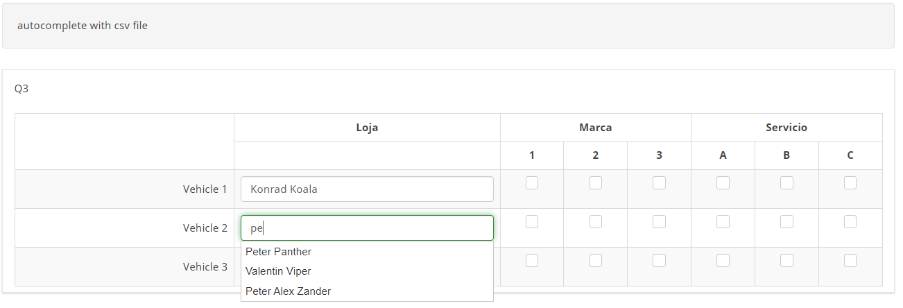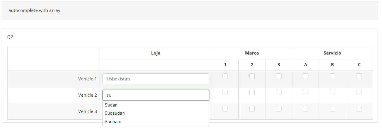 <script type="text/javascript" charset="utf-8"> $(document).on('ready pjax:scriptcomplete',function(){ var thisQuestion = $('#question{QID}'); // Add a question class thisQuestion.addClass('custom-array'); // Column-specific classes $('table.subquestion-list tr', thisQuestion).each(function(i) { $('th, td', this).each(function(i) { $(this).addClass('column-'+i); }); }); // Insert selects $('.answer-item.answer_cell_1', thisQuestion).addClass('with-select').append('<select class="inserted-select form-control list-question-select">\ <option value="">...</option>\ <option value="1">Option 1</option>\ <option value="2">Option 2</option>\ <option value="3">Option 3</option>\ </select>'); // Listeners on select elements $('.inserted-select', thisQuestion).on('change', function(i) { if($(this).val() != '') { $(this).closest('.answer-item').find('input:text').val($.trim($('option:selected', this).text())).trigger('change'); } else { $(this).closest('.answer-item').find('input:text').val('').trigger('change'); } }); // Returning to page $('.with-select input:text', thisQuestion).each(function(i) { var thisCell = $(this).closest('.answer-item'); var inputText = $.trim($(this).val()); $('select.inserted-select', thisCell).val(inputText); }); // Clean-up styles $('select.inserted-select', thisQuestion).css({ 'max-width': '100%' }); $('.with-select input:text', thisQuestion).css({ 'position': 'absolute', 'left': '-9999em' }); }); </script>
