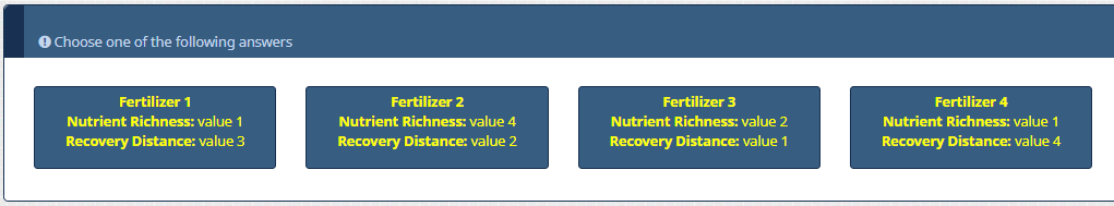 If they only select ONE preferred fertilizer, it is only a single choice question where you my style your answer options.I'd like my form's respondents to choose between four fertilizer options. Each fertilizer is characterized by two variables: nutrient richness and recovery distance.