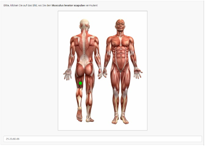 <div class="image-wrapper img-responsive center-block" style="border:2px solid #999; width: 100%;max-width: 500px; position:relative "> <img src="upload/surveys/{SID}/image/muskeln.jpg" style="border:0 none; width: 100%; height: auto;" /> </div> <script type="text/javascript" charset="utf-8"> $(document).ready(function() { // Identify this question var thisQuestion = $('#question{QID}'); // Hide the text input - un-comment below // $('input.text', thisQuestion).hide(); // $('.ls-answers', thisQuestion).hide(); // Create the click "marker" $('.image-wrapper', thisQuestion).append('<div class="click-marker" />'); var leftVal = 0; var topVal = 0; var displayVal = 'none'; if($.trim($('input.text', thisQuestion).val()) != '') { leftVal = $.trim($('input.text', thisQuestion).val()).split(',')[0]+'%'; topVal = $.trim($('input.text', thisQuestion).val()).split(',')[1]+'%'; displayVal = 'block'; } $('.click-marker', thisQuestion).css({ 'display': displayVal, 'position': 'absolute', 'left': leftVal, 'top': topVal, 'margin': '-10px 0 0 -10px', 'width': '18px', 'height': '18px', '-moz-border-radius': '10px', '-webkit-border-radius': '10px', 'border-radius': '10px', 'background': '#0C0', 'border': '1px solid #090' }); // Click event on the image $('.image-wrapper, img', thisQuestion).on('click', function(e) { var thisWidth = $(this).width(); var thisHeight = $(this).height(); var posX = $(this).offset().left; var posY = $(this).offset().top; var xCoord = e.pageX - posX; var yCoord = e.pageY - posY; var xCoordPercent = (xCoord/thisWidth)*100; var yCoordPercent = (yCoord/thisHeight)*100; // Load the click coordinates (as relative percentages) $('input:text', thisQuestion).val(xCoordPercent.toFixed(2)+','+yCoordPercent.toFixed(2)); // Reposition the marker $('.click-marker', thisQuestion).css({ 'display': 'block', 'left': xCoordPercent+'%', 'top': yCoordPercent+'%' }); }); // Returning to the page if($('input:text', thisQuestion).val() != '') { var coords = $.trim($('input:text', thisQuestion).val()).split(','); $('.click-marker', thisQuestion).css({ 'display': 'block', 'left': coords[0]+'%', 'top': coords[1]+'%' }); } }); </script>