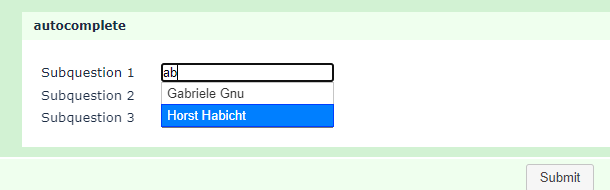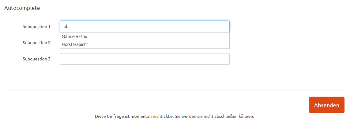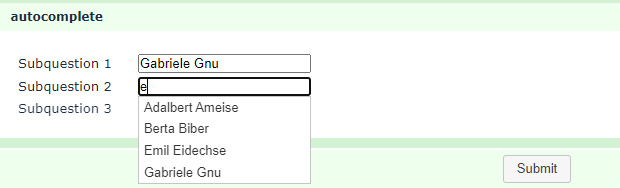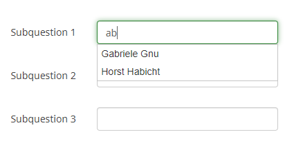 <link href="//code.jquery.com/ui/1.12.1/themes/base/jquery-ui.css" rel="stylesheet" /><script src="https://code.jquery.com/ui/1.12.1/jquery-ui.js"></script> <script type="text/javascript" charset="utf-8"> $(document).ready(function() { $('#question{QID} input[type="text"]:eq(0)').autocomplete({ minLength: 1, source: ["Adalbert Ameise", "Berta Biber", "Carlo Chinchilla", "Doris Dachs", "Emil Eidechse", "Florian Flamingo", "Gabriele Gnu", "Horst Habicht"] }); $('#question{QID} input[type="text"]:eq(1)').autocomplete({ minLength: 1, source: ["Adalbert Ameise", "Berta Biber", "Carlo Chinchilla", "Doris Dachs", "Emil Eidechse", "Florian Flamingo", "Gabriele Gnu", "Horst Habicht"] }); $('#question{QID} input[type="text"]:eq(2)').autocomplete({ minLength: 1, source: ["Adalbert Ameise", "Berta Biber", "Carlo Chinchilla", "Doris Dachs", "Emil Eidechse", "Florian Flamingo", "Gabriele Gnu", "Horst Habicht"] }); }); </script>