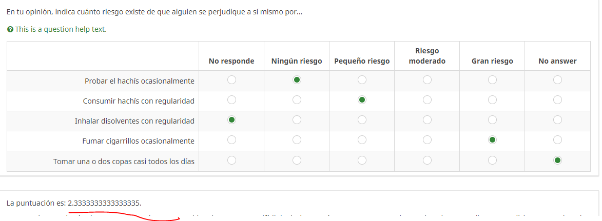 I am trying to make an equation to qualify the scores of a scale but I have a question. The scale reads: Score from 1 = "No risk" to 4 "Great risk" and consider the answer "Hard to say / I don't know" as not answered. Therefore, I need the number of questions with which the average is made to be variable depending on the number of questions answered in a matrix. For example, if the respondent only answers 4 questions out of 6 (not responding Q1_2 and Q1_4) it will be like this:{(sum(Q1_1.NAOK, Q1_3.NAOK, Q1_5.NAOK, Q1_6.NAOK)) / 4)}