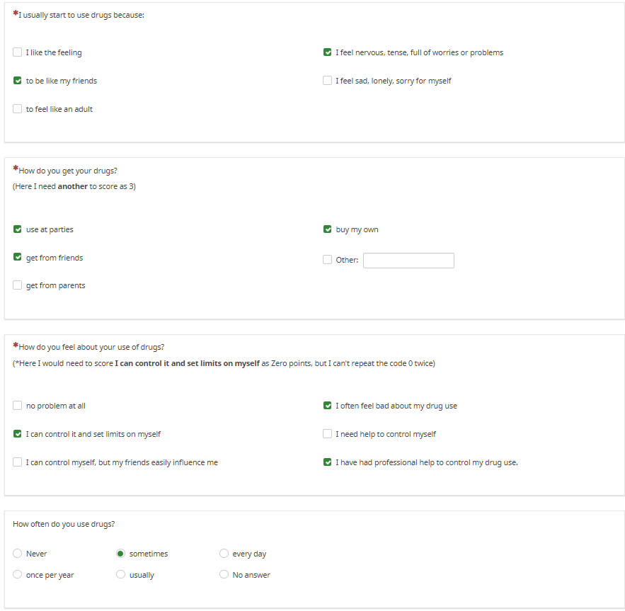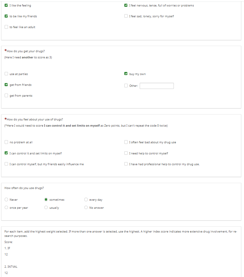 {sum(max(1*intval(Q1_1=="Y"),2*intval(Q1_2=="Y"),3*intval(Q1_3=="Y"),4*intval(Q1_4=="Y"),5*intval(Q1_5=="Y")),max(1*intval(Q2_1=="Y"),2*intval(Q2_2=="Y"),3*intval(Q2_3=="Y"),4*intval(Q2_4=="Y")),max(1*intval(Q3_1=="Y"),3*intval(Q3_3=="Y"),4*intval(Q3_4=="Y"),5*intval(Q3_5=="Y"),6*intval(Q3_6