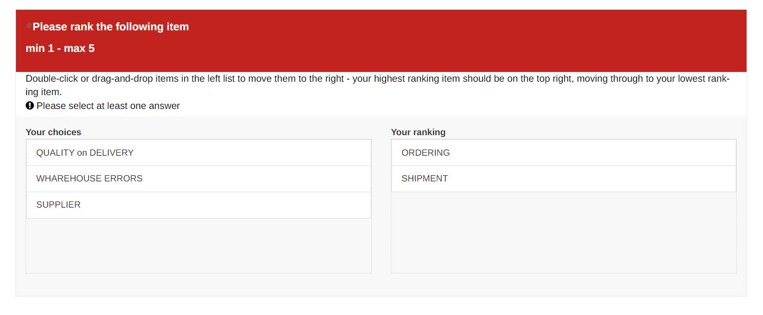 I have 3 questions. The first is a rank (answer: SHIPMENT, ORDERING, WAREHOUSE, ETC). the second is Q-SHIPMENT( rank question with answers related to shipment), the third is Q-ORDERING (rank question with answers related to ordering)