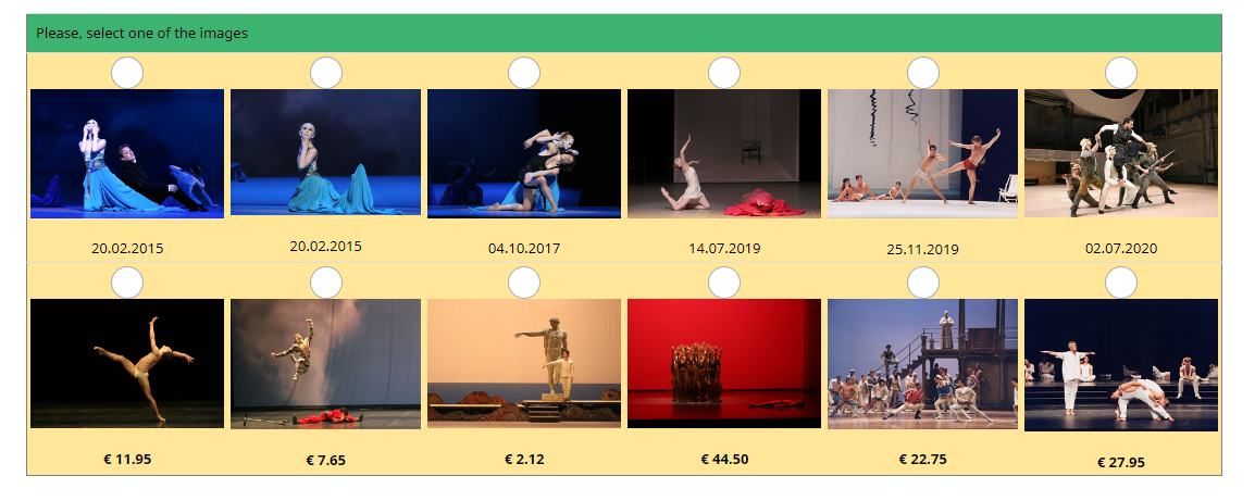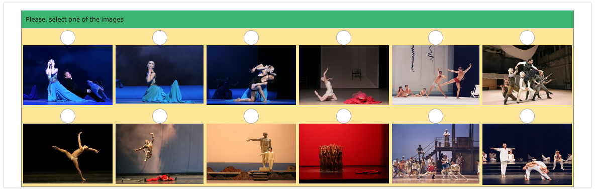 <table align="center" border="1" cellpadding="5" cellspacing="3" class="table table-responsive" style="width:1100px"> <tbody> <tr> <td class="td0 lightgreen" colspan="6">Please, select one of the images</td> </tr> <tr style="height:80px;"> <td class="td0 center yellow"><img class="img-responsive center-block" src="https://www.myServer.de/userfiles/Hamburg-Ballett_02.jpg" /></td> <td class="td0 center yellow"><img class="img-responsive center-block" src="https://www.myServer.de/userfiles/Hamburg-Ballett_03.jpg" /></td> <td class="td0 center yellow"><img class="img-responsive center-block" src="https://www.myServer.de/userfiles/Hamburg-Ballett_04.jpg" /></td> <td class="td0 center yellow"><img class="img-responsive center-block" src="https://www.myServer.de/userfiles/Hamburg-Ballett_05.jpg" /></td> <td class="td0 center yellow"><img class="img-responsive center-block" src="https://www.myServer.de/userfiles/Hamburg-Ballett_06.jpg" /></td> <td class="td0 center yellow"><img class="img-responsive center-block" src="https://www.myServer.de/userfiles/Hamburg-Ballett_07.jpg" /></td> </tr> <tr style="height:80px;"> <td class="td0 center yellow"><img class="img-responsive center-block" src="https://www.myServer.de/userfiles/Hamburg-Ballett_08.jpg" /></td> <td class="td0 center yellow"><img class="img-responsive center-block" src="https://www.myServer.de/userfiles/Hamburg-Ballett_09.jpg" /></td> <td class="td0 center yellow"><img class="img-responsive center-block" src="https://www.myServer.de/userfiles/Hamburg-Ballett_10.jpg" /></td> <td class="td0 center yellow"><img class="img-responsive center-block" src="https://www.myServer.de/userfiles/Hamburg-Ballett_16.jpg" /></td> <td class="td0 center yellow"><img class="img-responsive center-block" src="https://www.myServer.de/userfiles/Hamburg-Ballett_12.jpg" /></td> <td class="td0 center yellow"><img class="img-responsive center-block" src="https://www.myServer.de/userfiles/Hamburg-Ballett_13.jpg" /></td> </tr> </tbody> </table>