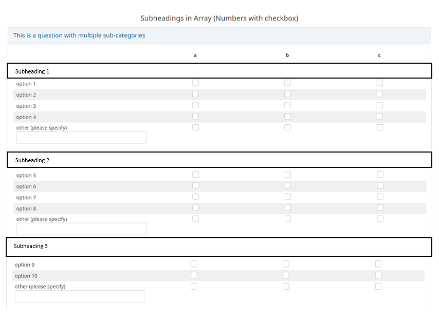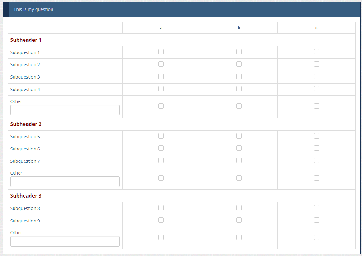 // Move the hidden text inputs into the array $('th.answertext:eq(7)', thisQuestion).append($('input[type="text"]', nextQuestions[0])).closest('tr').addClass('otherRow'); $('th.answertext:eq(11)', thisQuestion).append($('input[type="text"]', nextQuestions[1])).closest('tr').addClass('otherRow'); $('th.answertext:eq(14)', thisQuestion).append($('input[type="text"]', nextQuestions[2])).closest('tr').addClass('otherRow');