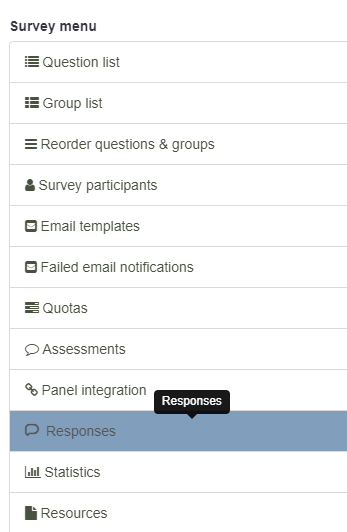 My problem is the first step. The top bar where the "Responses" button is supposed to be only shows "Stop this survey", "Execute Survey", "Tools", and "Export". Neither "Survey Participants" nor "Responses" which should be right there.