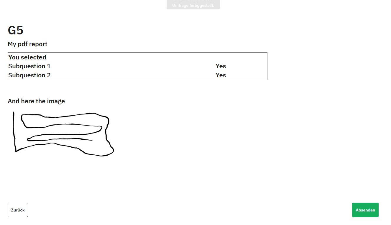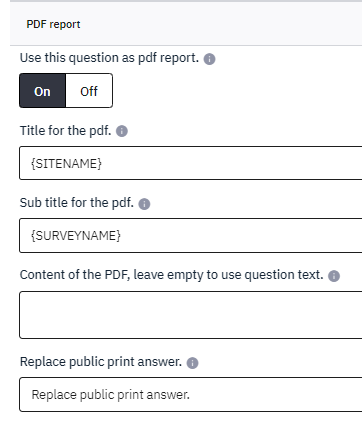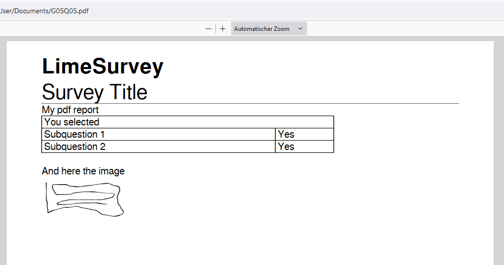 <p>My pdf report</p> <table border="1" collapse="collapse" width="70%"> <tbody> <tr> <th colspan="2">You selected</th> </tr> <tr> <td style="width:80%">Subquestion 1</td> <td style="width:20%">{if(Q1_SQ001=="Y","Yes","No")}</td> </tr> <tr> <td style="width:80%">Subquestion 2</td> <td style="width:20%">{if(Q1_SQ002=="Y","Yes","No")}</td> </tr> </tbody> </table> <br /><br />And here the image<br /><img src="{Q3}" />